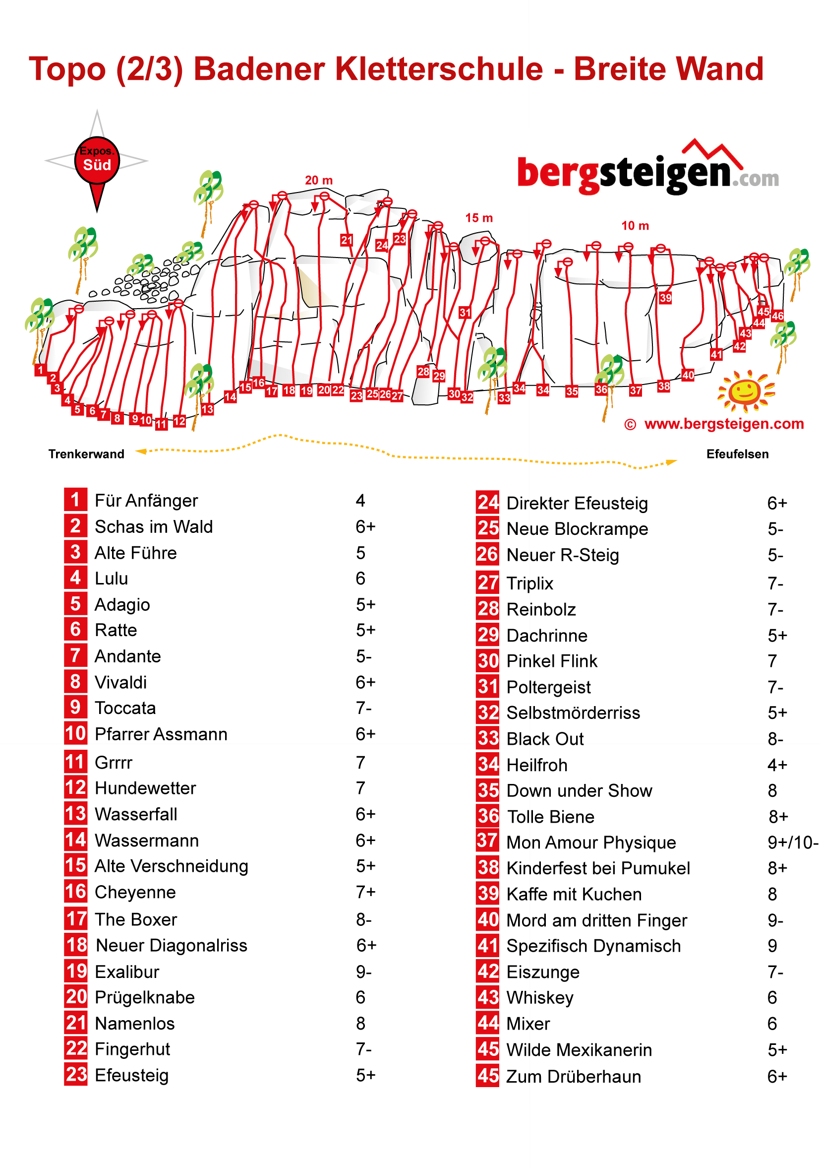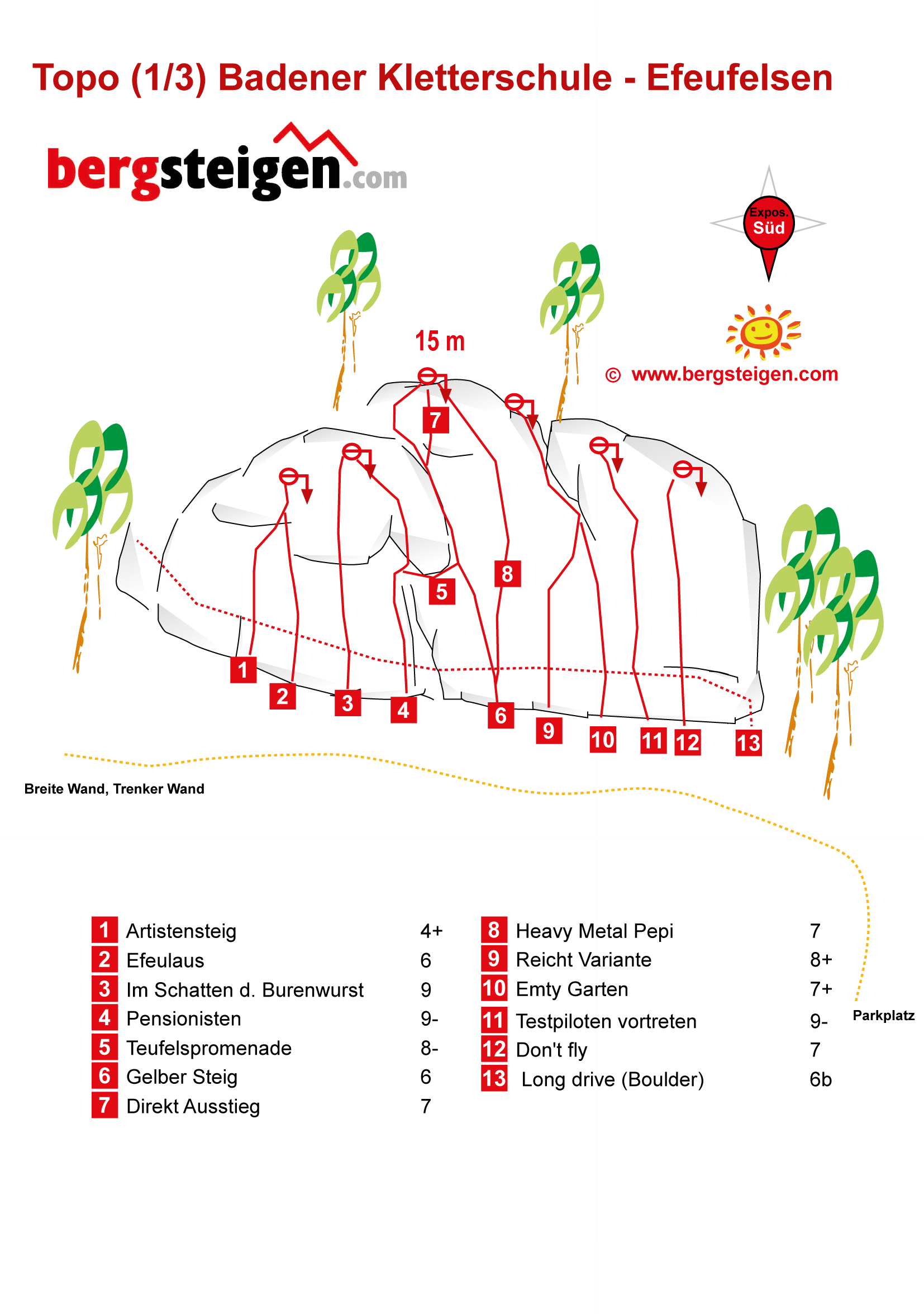 Traditionsreicher Klettergarten, der von Christian Hacker saniert und mit vielen neuen Touren ausgestattet wurde. Der Klettergarten besteht aus sechs Formationen mit unterschiedlicher Wandhöhe, wobei in der Regel am Efeufels, der Breiten Wand und der Trenkerwand geklettert wird, Rest unlohnend. Der Fels ist schon relativ abgeschmiert. Südseitige Lage, aber im Wald.
