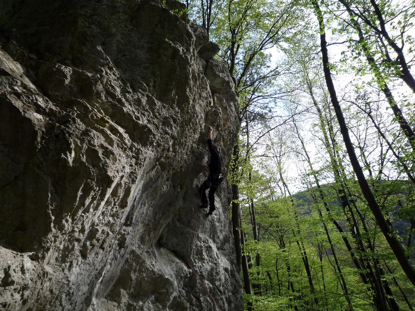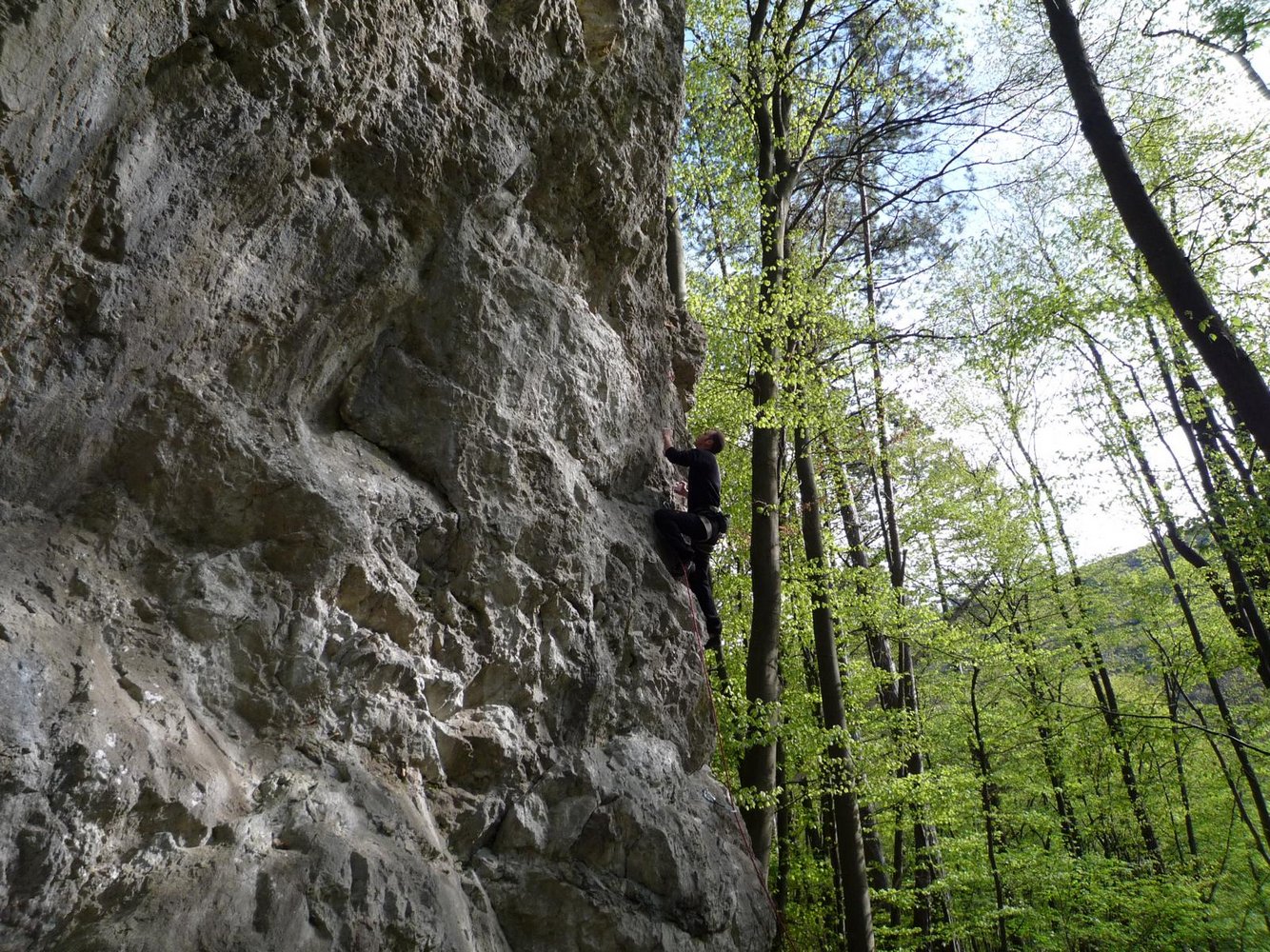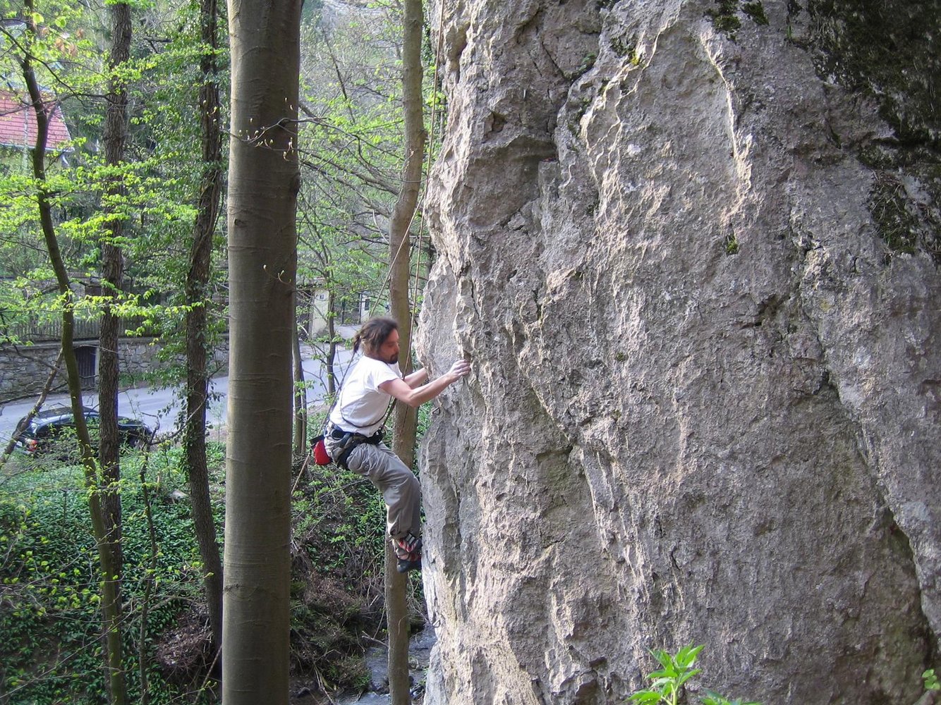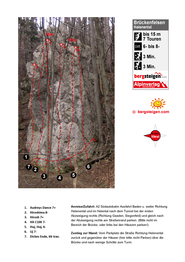 Netter kleiner Turm neben der Straßer der sechs schöne, leicht überhängde Routen im festen Fels bietet. Erschlossen von Christian Hacker.