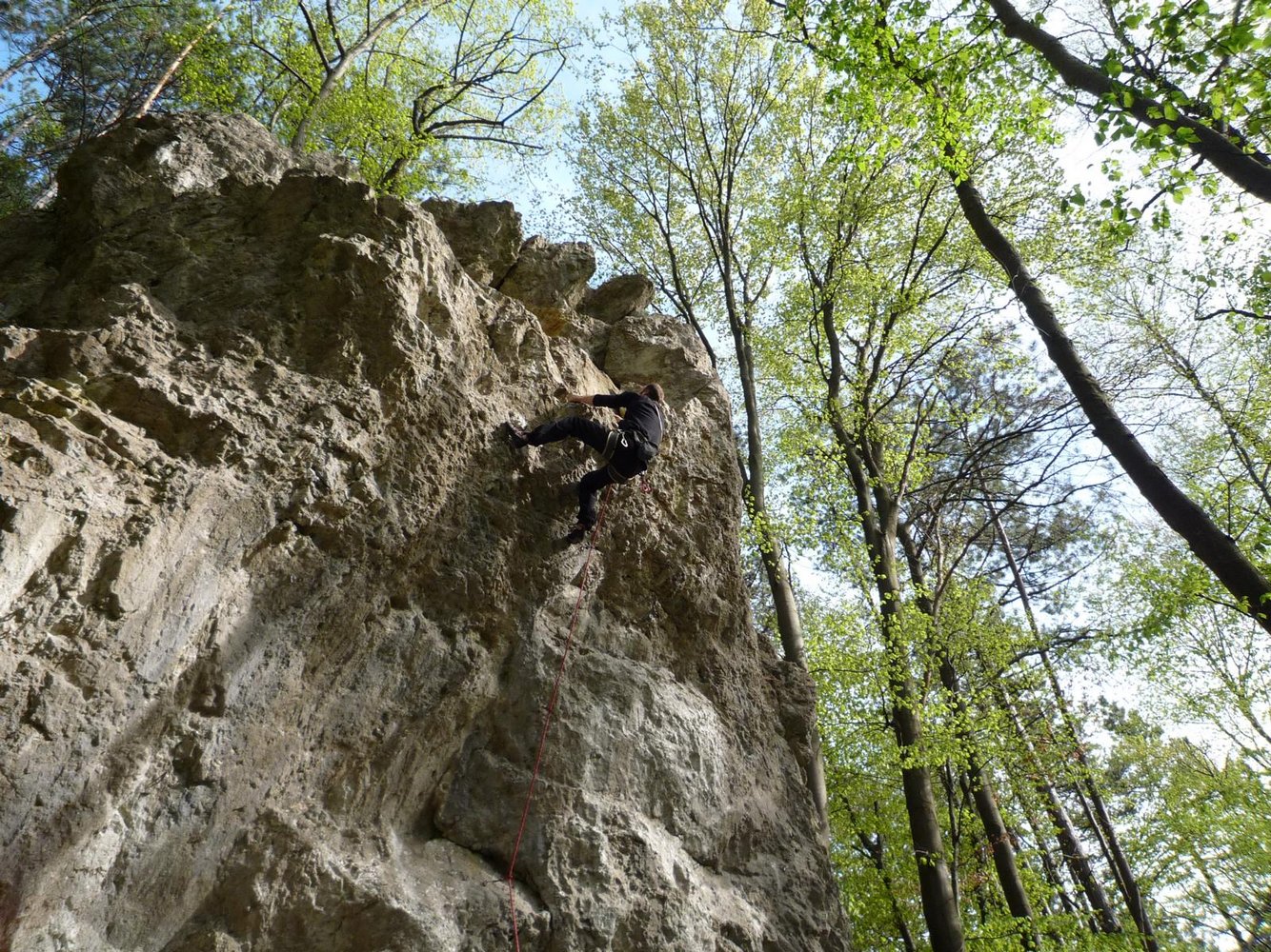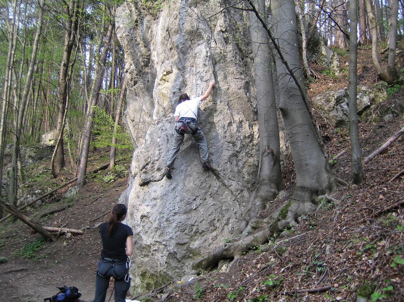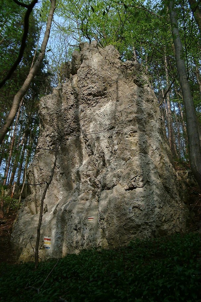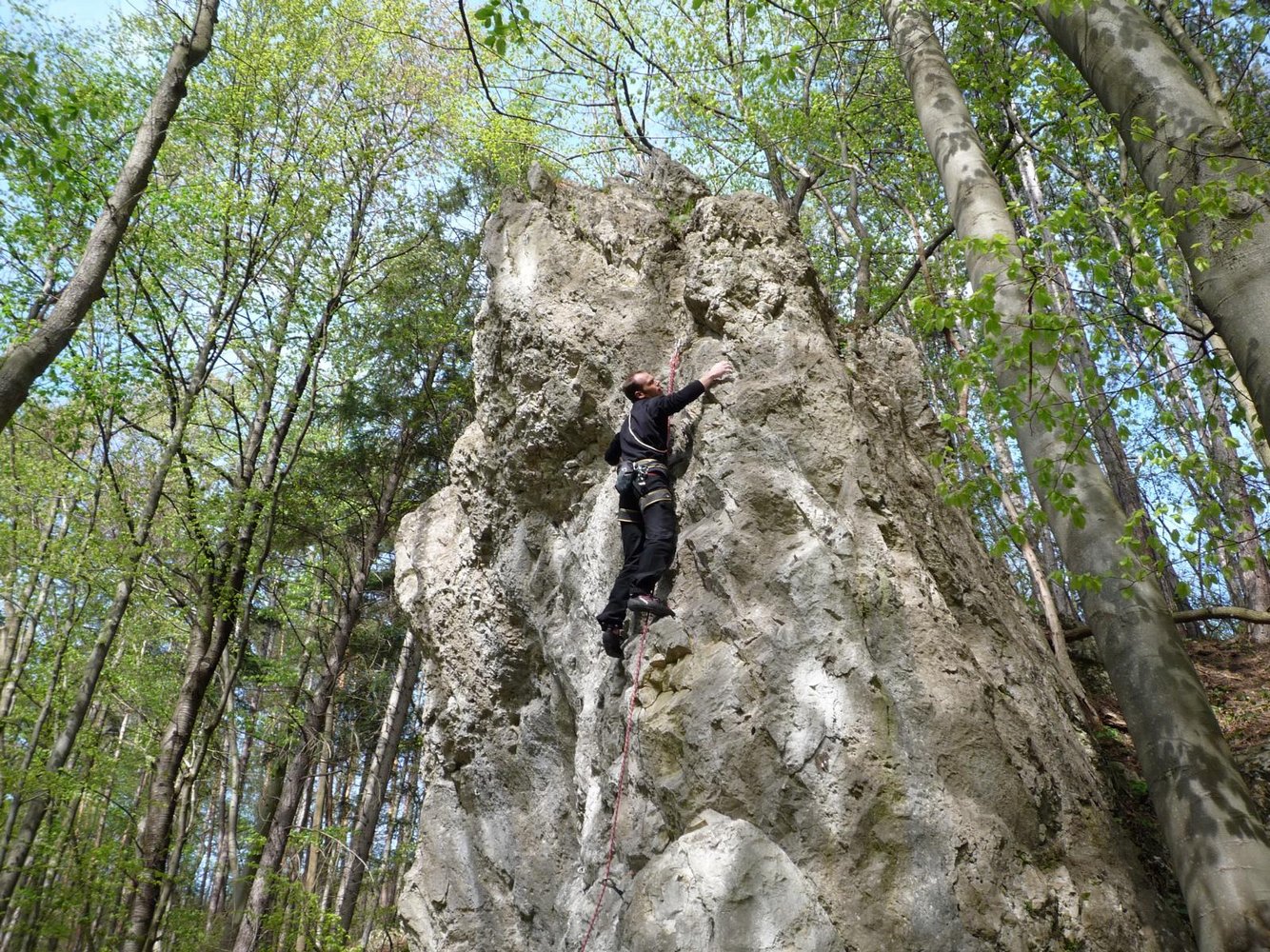 Netter kleiner Turm neben der Straßer der sechs schöne, leicht überhängde Routen im festen Fels bietet. Erschlossen von Christian Hacker.