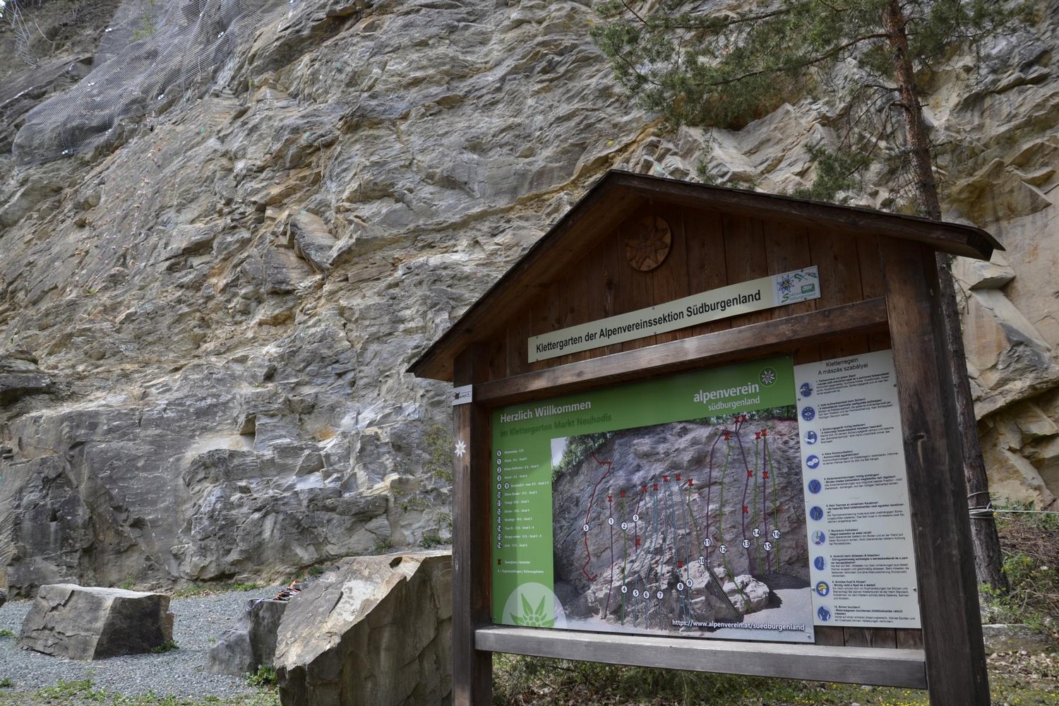 Der Klettergarten Markt Neuhodis ist das Herzstück des Alpenverein Sektion Südburgenland und bietet heute eine Vielzahl an Kletterrouten auf Schiefer sowie eine Wand mit vorgebohrten Griffen. Perfekt für Anfänger und erfahrene Kletterer in ruhiger, angenehmer Atmosphäre. Wer die Abgeschiedenheit sucht, einfach einmal durchschnaufen möchte oder Begeisterte auf der Suche nach Action auf einer der Naturfels-Routen, sind Herzlich Willkommen. Der Eintritt ist frei - die Benützung auf eigene Gefahr!