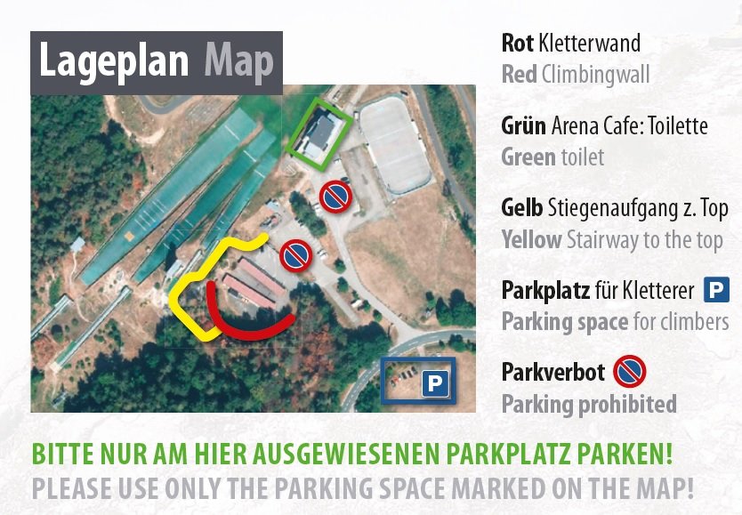 Vom Parkplatz in wenigen Schritten zum Klettergarten. Siehe Lageplan bei den Bildern!