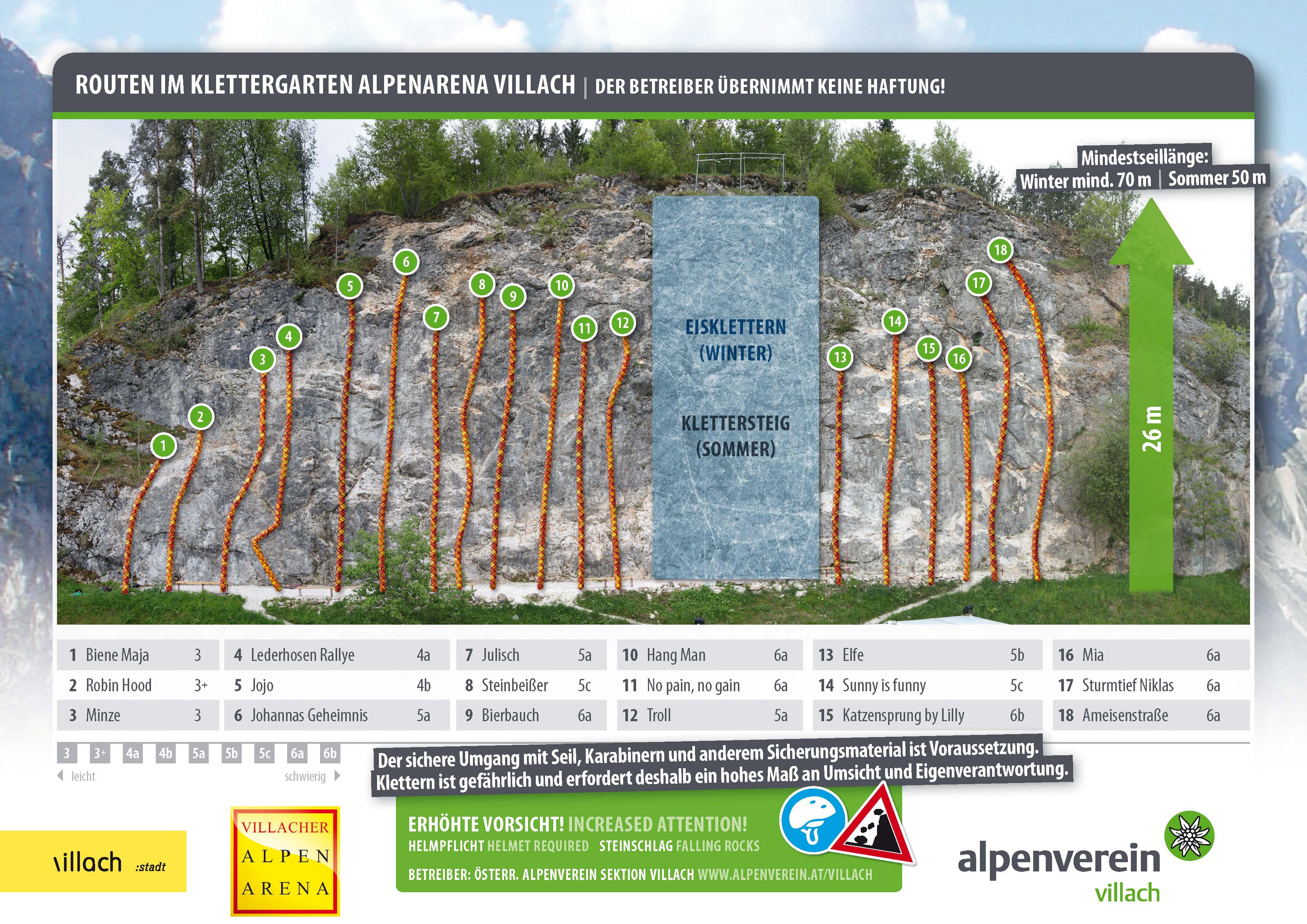 - Mindestseillänge 50m im Sommer, 70m im Winter