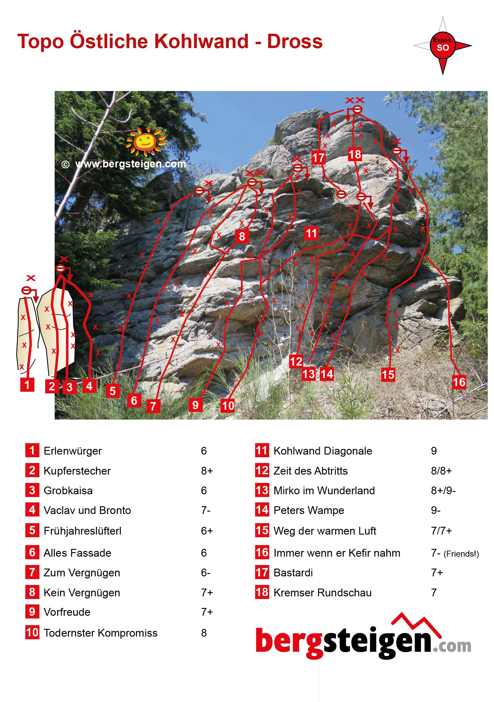 Sehr schöner und extrem überhängender Klettergarten in den tiefen, stillen Wäldern des Kremstales. Man klettert hier völlig ungestört in einem dichten Fichtenwald und genießt am Ausstieg einen wundervollen Blick ins Kremstal. Bei der Kletterei dominieren große Aufleger und Kanten im felsenfesten Granit. Die Östliche Kohlwand ist südostseitig gelegen, die Fichten spenden jedoch etwas Schatten. Am linken Rand der Kohlwand finden sich auch einige senkrechte leichtere Wandklettereien. Alle Routen sind mit Klebebohrhaken gut gesichert. Der Hauptteil der bis zu 20 m hohen östlichen Kohlwand ist jedoch sehr stark überhängend und bietet athletische Kletterei im 8ten Grad. Die Wand hängt auf 10m gut 5 m über. Der Abstieg erfolgt durch Ablassen am letzten Bühlerhaken vor der kurzen Gipfelwand.