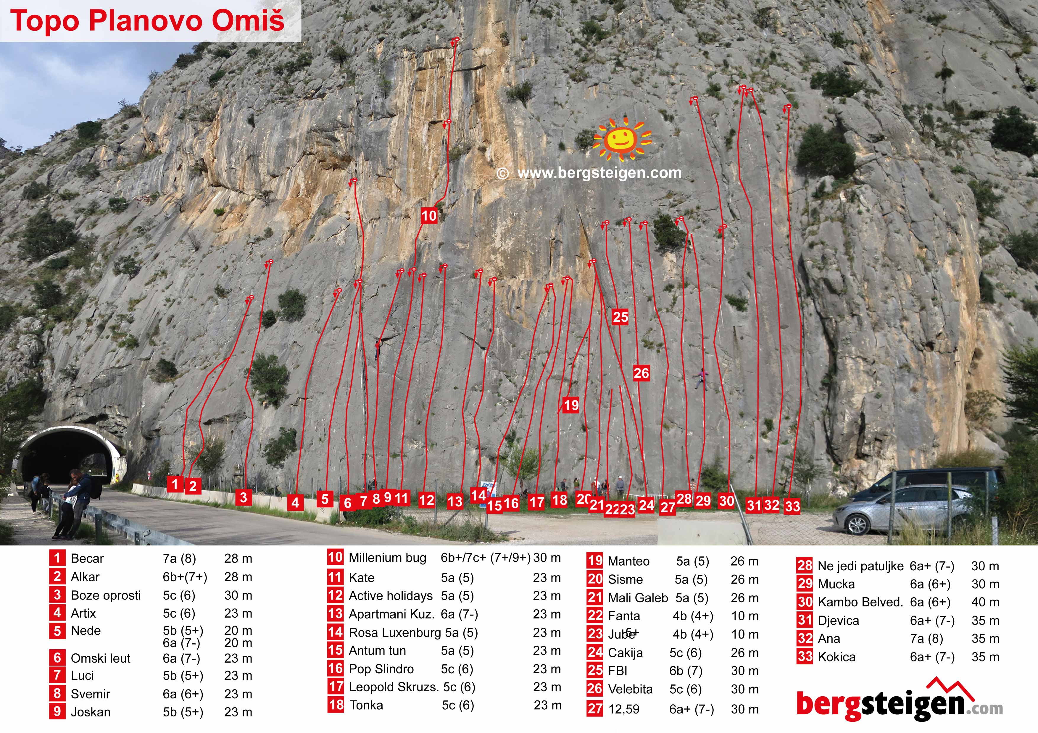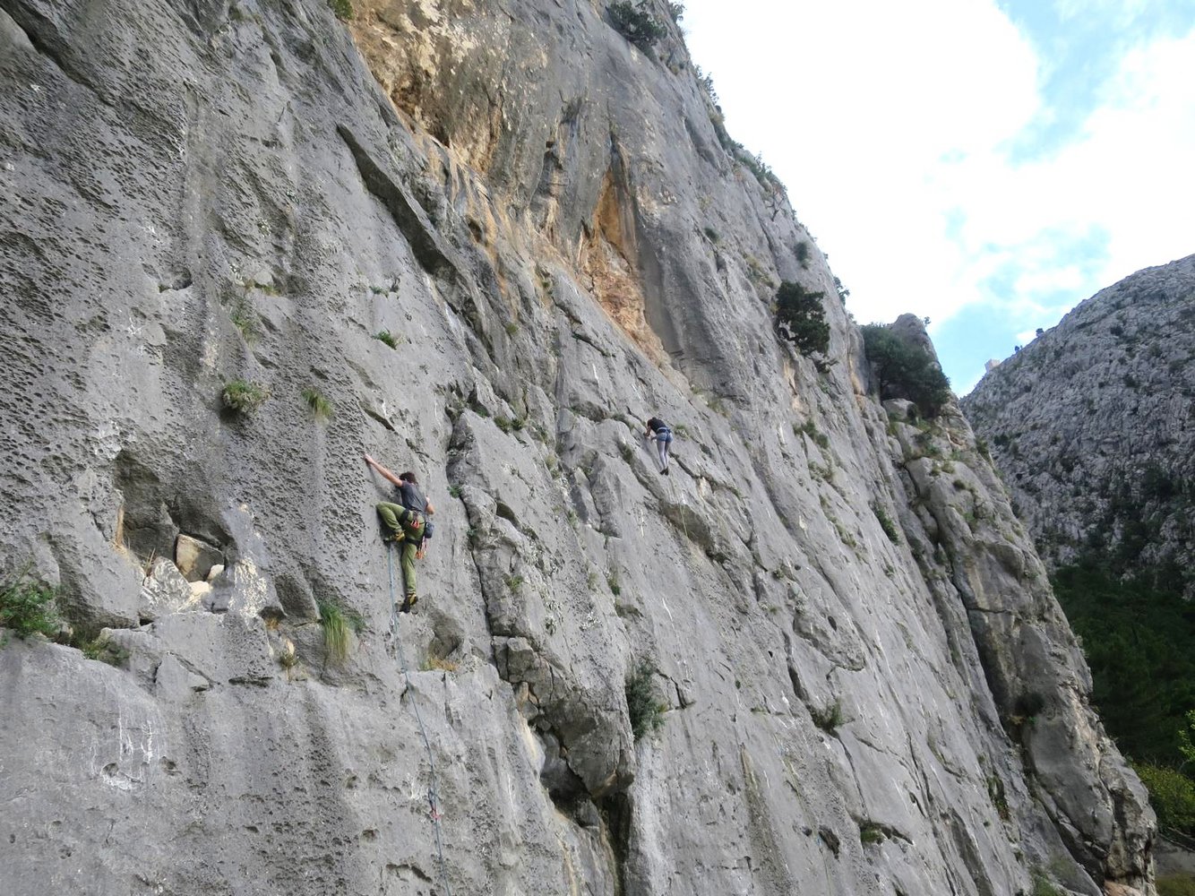 Sehr schöner Klettergarten, quasi mitten im Ort Omiš gelegen. Der Fels ist perfekt und wasserzerfressen, die Routen sind großteils leicht und gut mit Bolts und Umlenkern gesichert. Last but not least ist der Zustieg kurz. Durch die südseitige Lage nur in den Wintermonaten zu empfehlen, die Sonne erreicht den Klettergarten um ca. 10:00 Uhr und bleibt dann bis zum Abend.