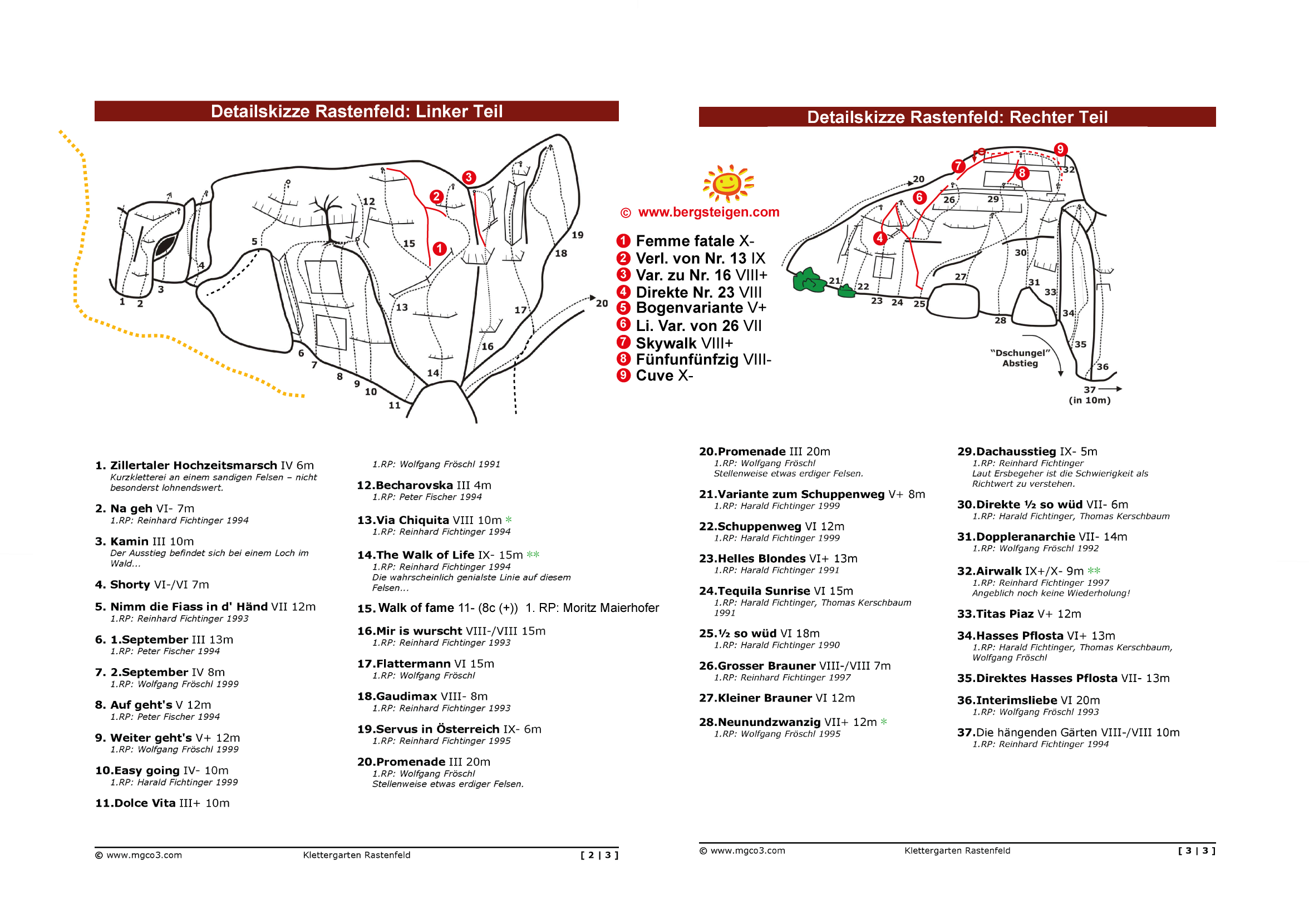 Alle Touren sind am Einstieg angeschrieben. Haupterschließer sind Harald u. Reinhard Fichtinger, Thomas Kerschbaum und Wolfgang Fröschl. Ideal im Frühjahr oder Herbst ,im Sommer sicher sehr heiße Gegend. Im Winter ist die Wand durch den gegenüberliegenden Hügel bald im Schatten.