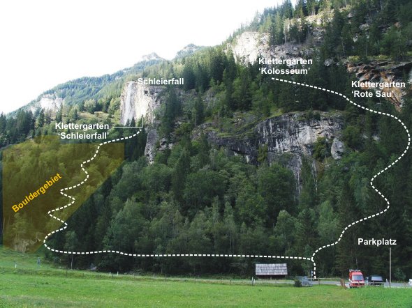 Bitte unbedingt auf den beschilderten Wegen bleiben und nicht über die Wiesen gehen!!! Vom Parkplatz startet ein beschilderter Weg zum Bouldergebiet. Ein Steig führt an vielen beschrifteten Blöcken steil hinauf. Beim Block “Big Easy” rechts halten, noch etwas höher aufsteigen und den Wegspuren zur Wand folgen.