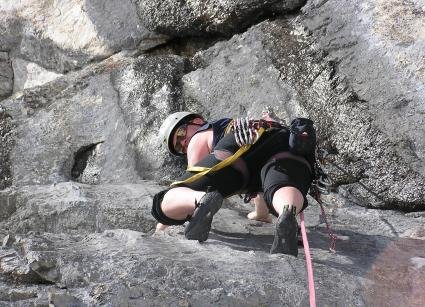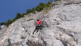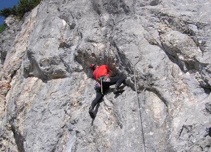 Klettergartenmäßig mit Bohrhaken abgesichert, Klemmkeile oder Friends sind nicht erforderlich.