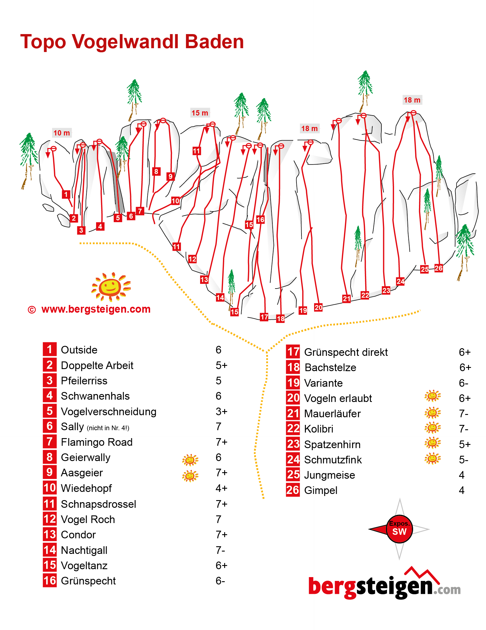 Vom Parkplatz in Baden Richtung Helenental und zum vor dem Tunnel gelegenen Jammerwandl. Zwischen Wand und dem alleinstehenden Haus geht ein Wanderweg leicht nach Nordwesten (Richtung Helenental) bergauf und man kommt nach 5 min. zu einer Kreuzung. Hier den rechten Weg wieder Richtung Baden folgen nach 3 Min. direkt beim Weg Felsen auftauchen. Davor führt eine Wegspur steil hinauf zum Vogelwandl.