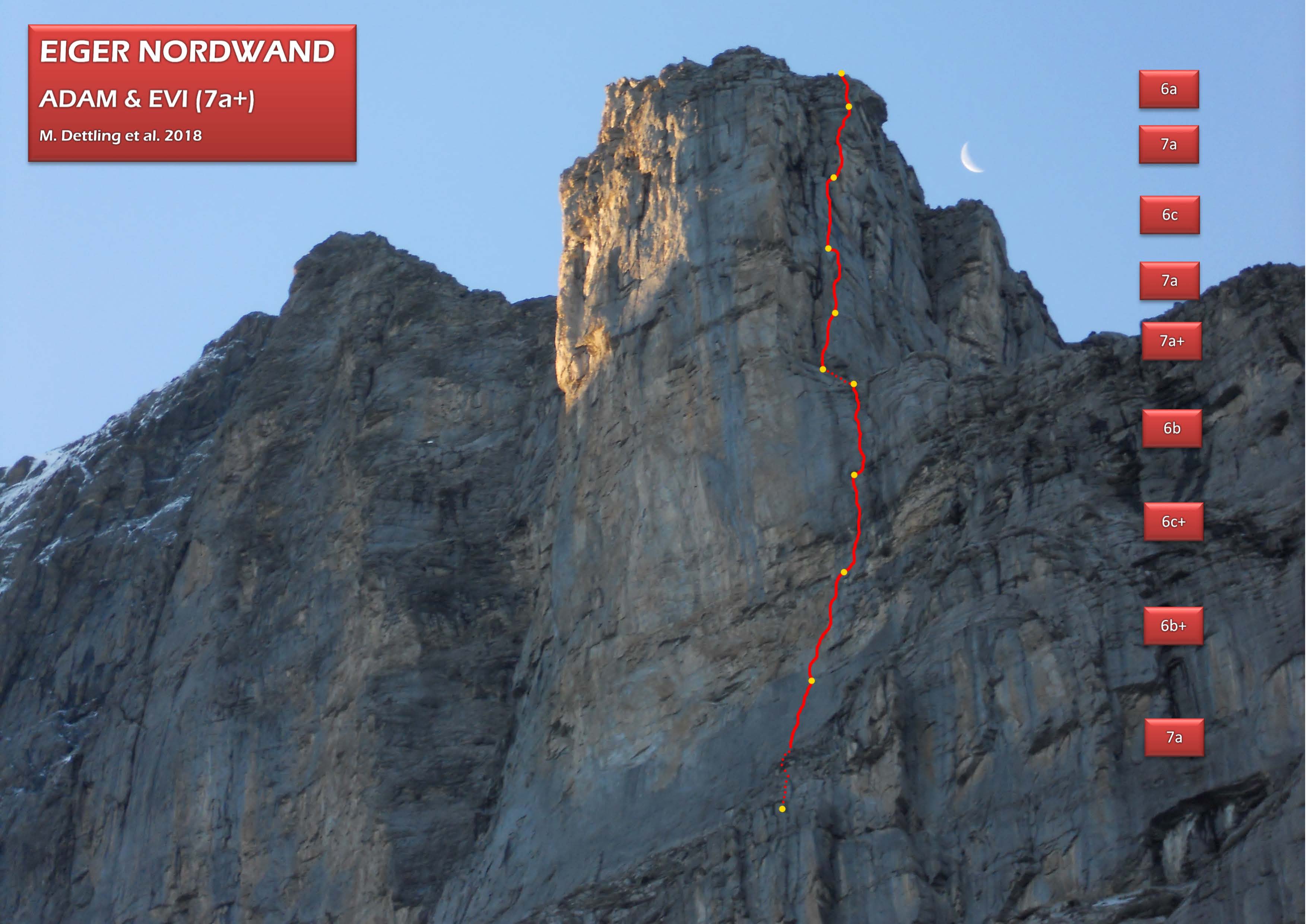 Alpine Sportklettertour, die sehr viel Abwechslung bietet. Von der Knallerplatte zu griffiger Wandkletterei, über henklige Überhänge zu fantastischem Lochfels, wasserzerfressenem Crimpy‐Gelände, ein paar griffigen Rissen und sogar rätikonartigem Plattenkalk ist fast alles vorhanden. Die Felsqualität ist über weite Strecken sehr gut bis hervorragend. Wie überall am Eiger liegt hier und da etwas loses Geröll auf den Bändern und Griffausbruch‐Spezialisten werden die Möglichkeit finden, ihr Metier zu praktizieren.