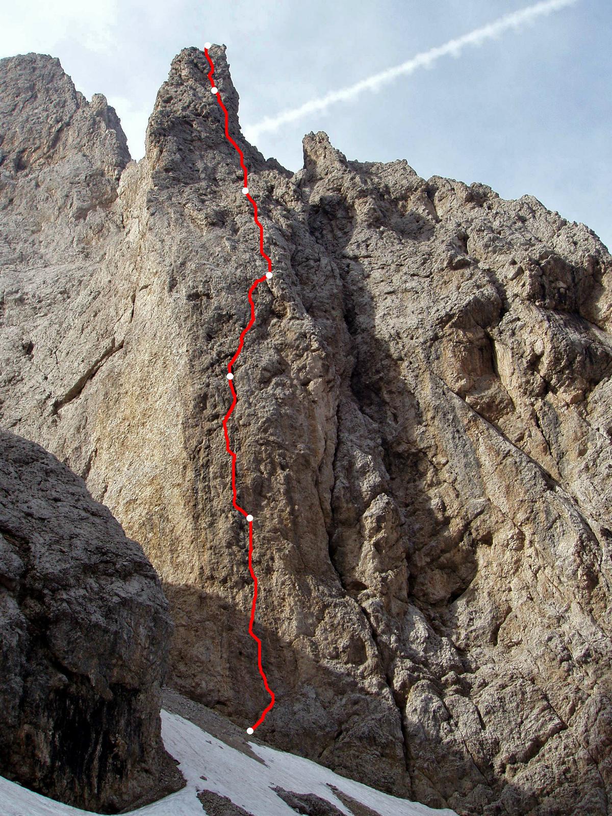 Sellajoch mit der Gondelbahn zur Langkofelscharte (Betriebszeit vom 18. Juni bis 2. Oktober, täglich ab 8:17 bis 17 Uhr), oder zu Fuß auf markiertem Weg (1¼ Stunden). Von der Demetz-Hütte (2685 m) entlang der Pfadspur die Schutthalde queren und durch die Geröllrinne hinab unter die schmale Nordwand hinab. Einstieg bei Standhaken.