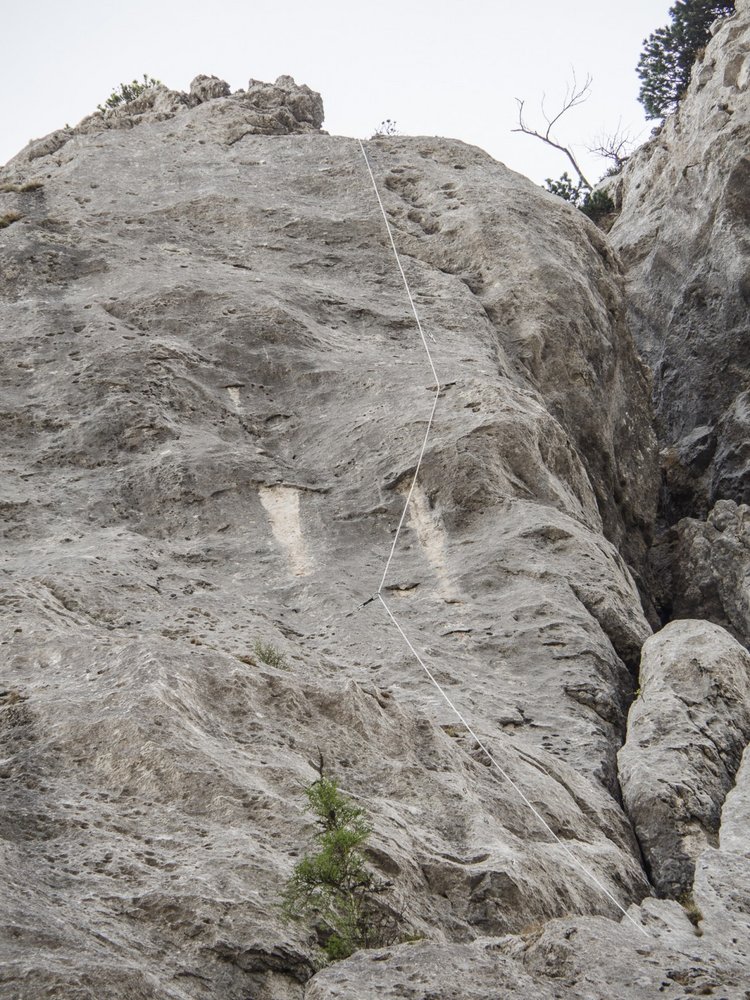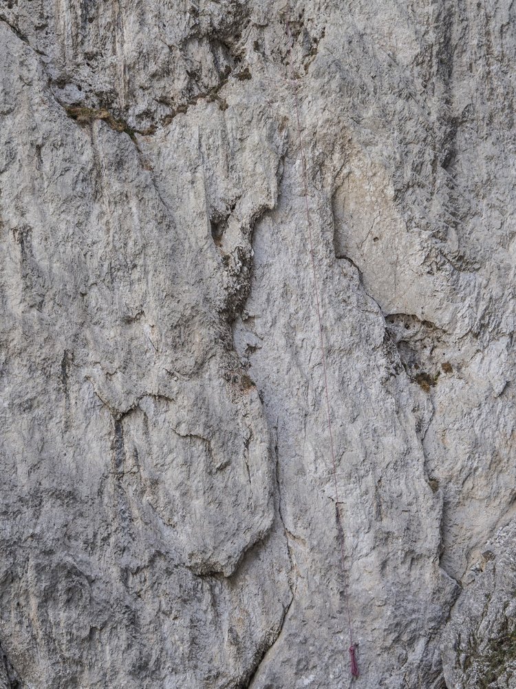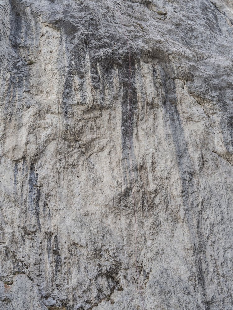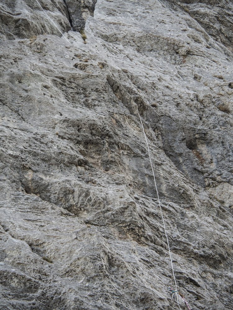 Die Linie zieht zentral, entlang eines schwarzen Wasserstreifens, durch den zentralen Wandabschnitt. Auch nach ergiebigen Regenfällen bleibt die Wand lange trocken. Die Hakenabstände dürfen vor allem in den flachen Bereichen nicht unterschätzt werden.