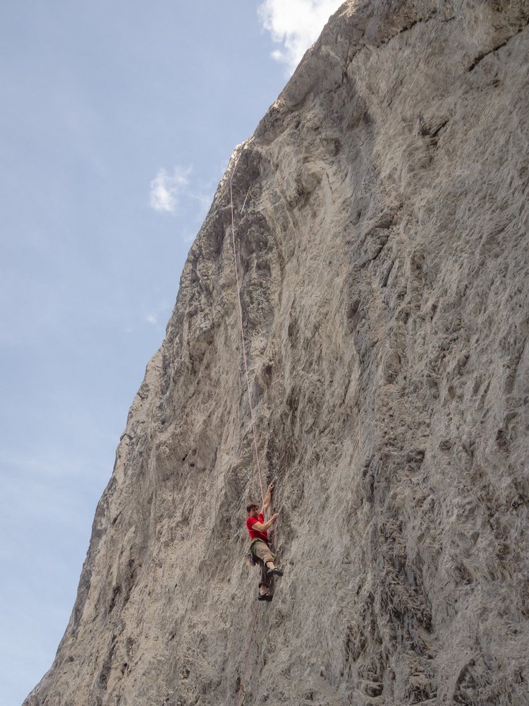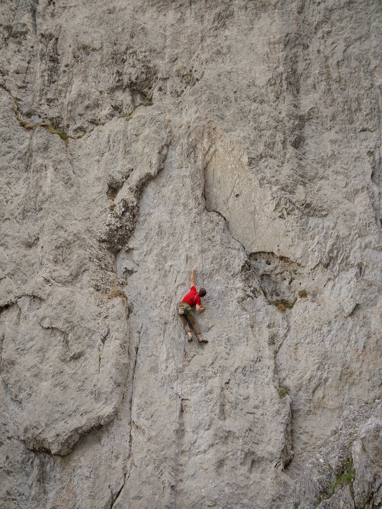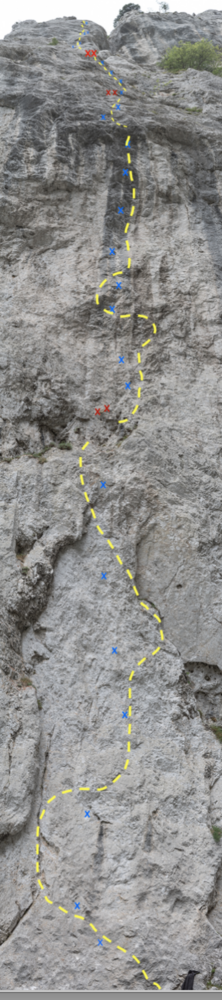 Gut abgesicherte, dennoch zwingend zu kletternde, athletische, leicht überhängende bis leicht geneigte fingerlastige Route. Unten spitzer, und kleingriffiger, oben genialer, solider löchriger Kalk. Die Wand ist eher windexponiert.