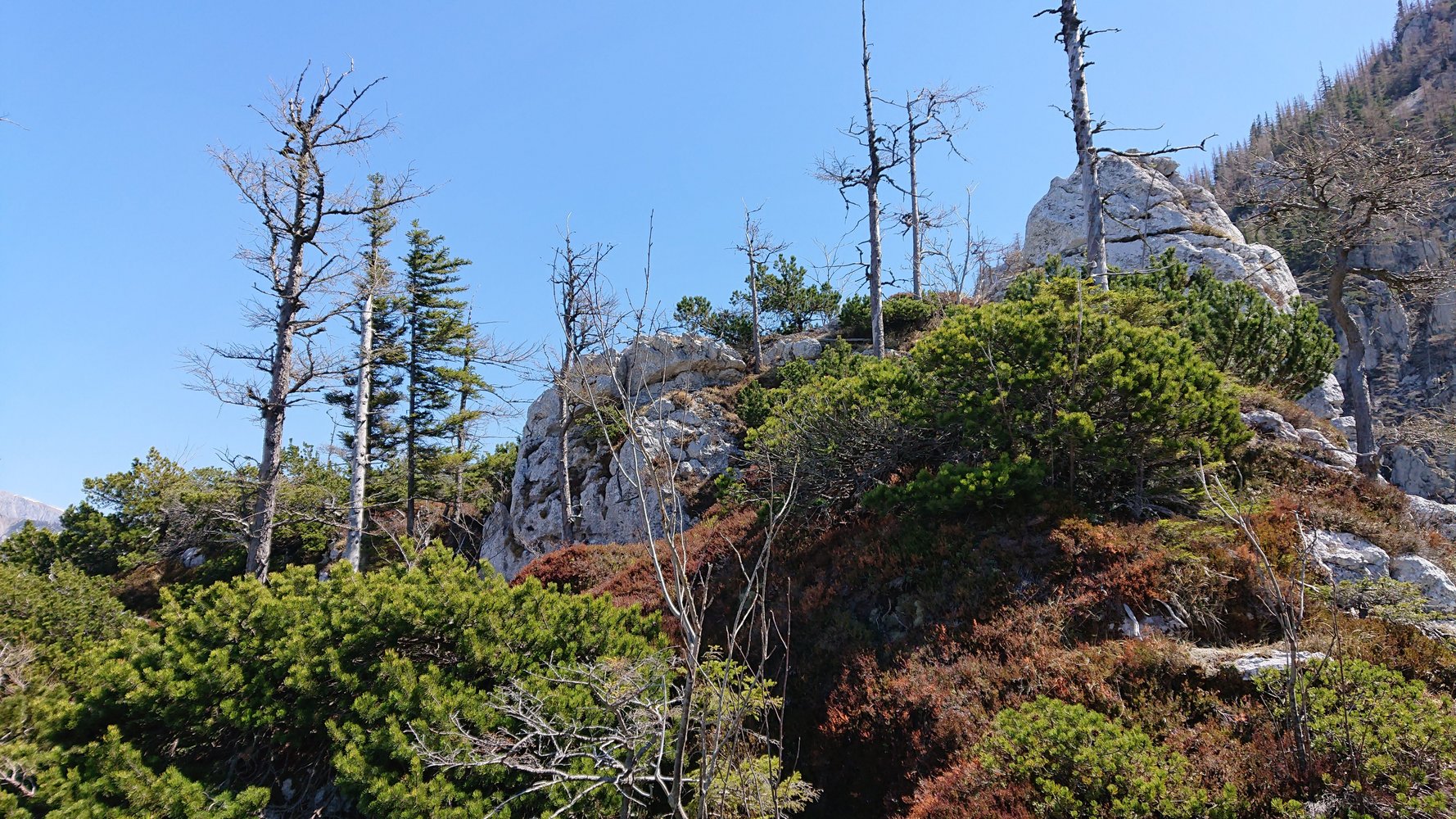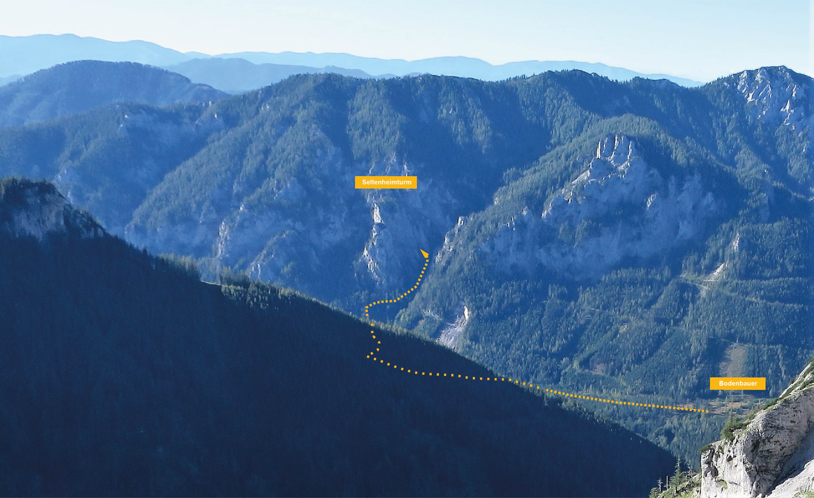 Vom Bodenbauer die Straße talauswärts. Den ersten Forstweg nach rechts, übers Schuttfeld, beim Schranken vorbei, gleich links durch Wiese, weiter am Waldrand, zu Blöcken im Wald, dem Jägersteig mit Steinmännern folgen, bei Salzlecke rechts, weiter bis unter die NW Seite, steil bergauf, rechts ins Freie über Gully und nun nach oben bis unter sie SSW Wand. Der Einstieg zu „Auf zu neuen Ufern" befindet sich zentral in der Südwand des Vogerl-/Seltenheimturms. 1.1 km, 400 Hm