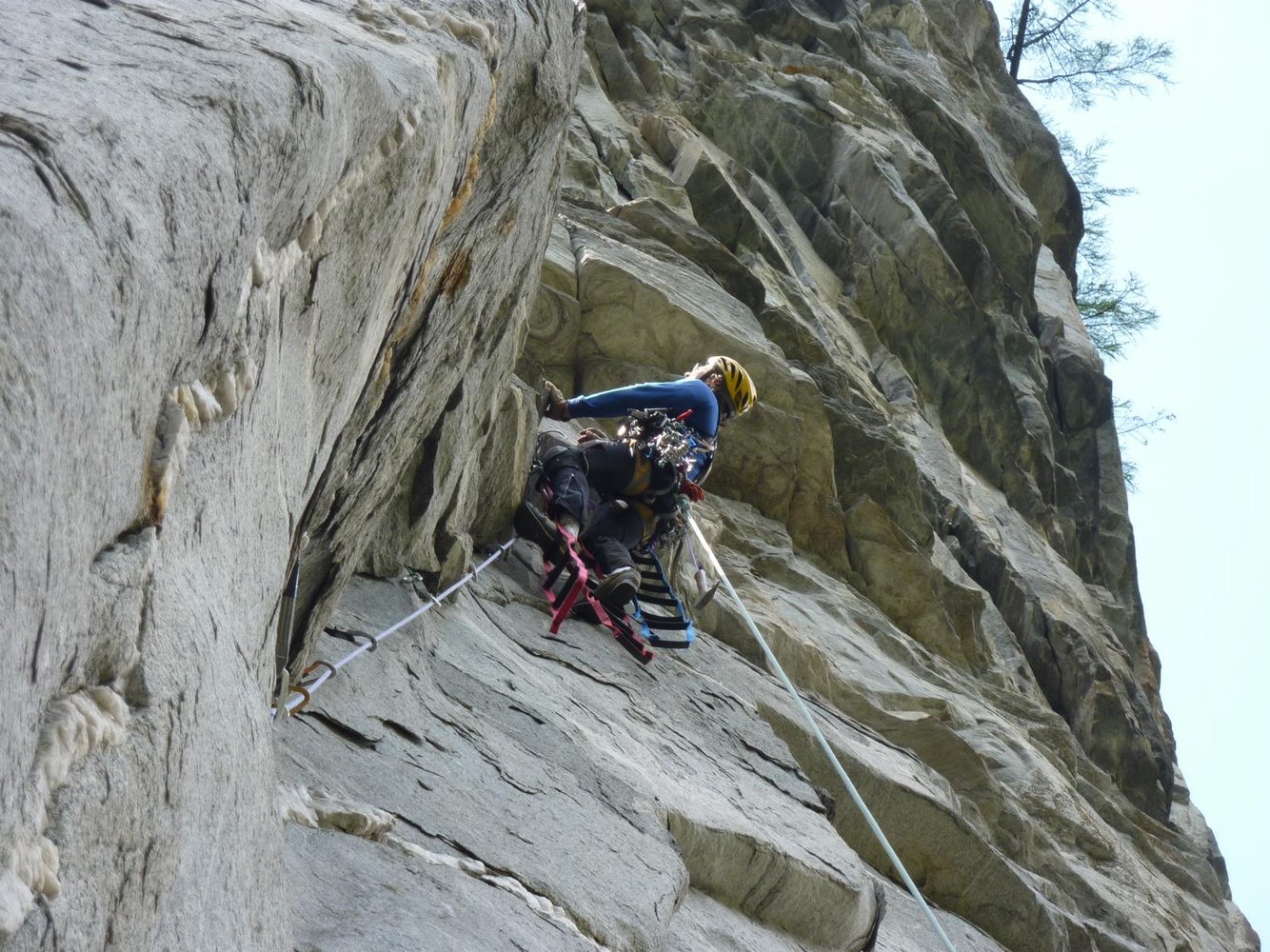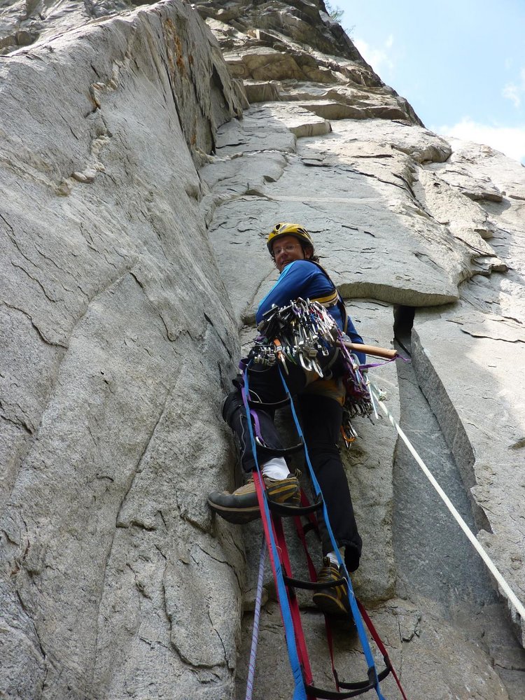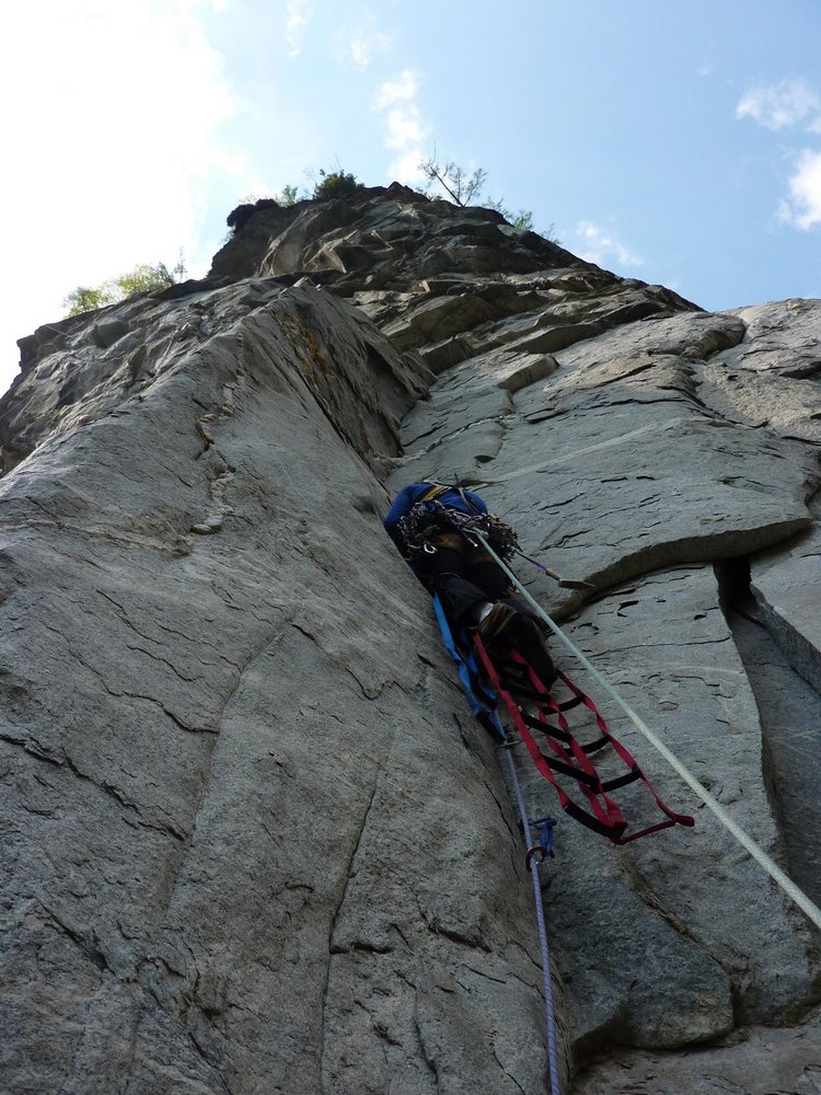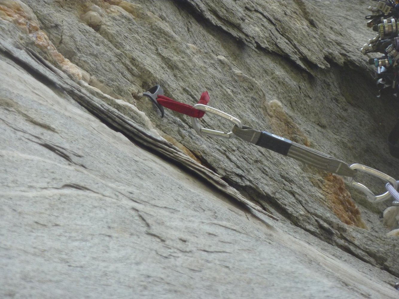 Seillänge und einen Rivet in der 2. Seillänge nichts. Es herrscht hauptsächlich diffizile Nagelei vor, wobei ohne Pecker gar nichts geht. Ab der 3. Seillänge ist die Tour sehr steil (siehe auch die Bemerkungen zum Abseilen über die Tour).