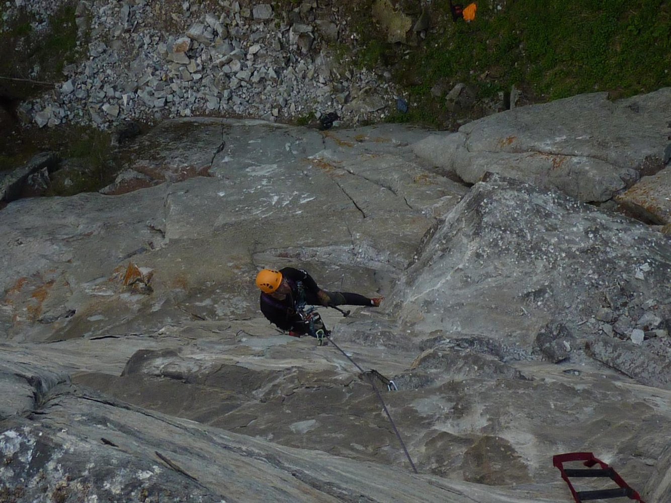 ziemlich brüchig und damit ein wenig heikel. Die Stände sind gebohrt, sonst steckt jedoch bis auf zwei Normalhaken in der ersten