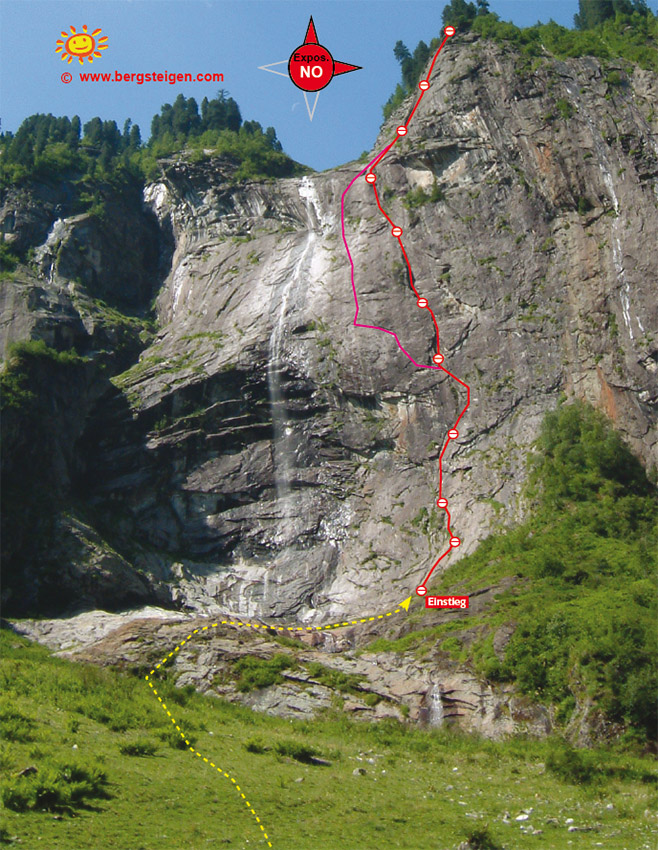 Ein Klassiker unter den mit Bohrhaken abgesicherten Granitrouten im Zillertal. Die lange Tour hat leider zwei etwas sandige Seillängen (Bezeichnung auf dem Topo, zweimal „Kärcherlänge“), dort ist Abenteuerlust gefragt. Der Erstbegeher hat tatsächlich gute Arbeit geleistet, um die Route überhaupt in diesen Zustand zu bringen. Man klettert an Granitplatten direkt neben dem Wasserfall - ein tolles Ambiente. Landschaftlich sehr schöne Tour, die sicher in dieser Schwierigkeit und Absicherung zu den längsten im Zillertal gehört.