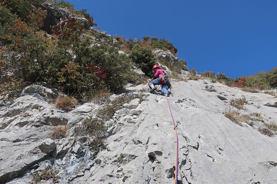 Die Via Cobra ist eine anregende, sehr homogene Kletterroute an dem steilen Felsabbruch Croz delle Mirandole. Senkrechte Wandkletterei wechselt mit griffigen Platten ab, die Schlüsselpassage ist ein Aufsteher an einem kleinen Bauch. Wegen der guten Bohrhakenabsicherung ist die Route recht gut besucht, was aber wegen der Kettenstände nicht wirklich ein Problem ist. Wer tolle Kletterei mit etwas Verdon-Feeling hoch oben im Sarcatal sucht, ist dort richtig - man hat einen tollen Ausblick in die Brenta und südlich bis zum Gardasee.