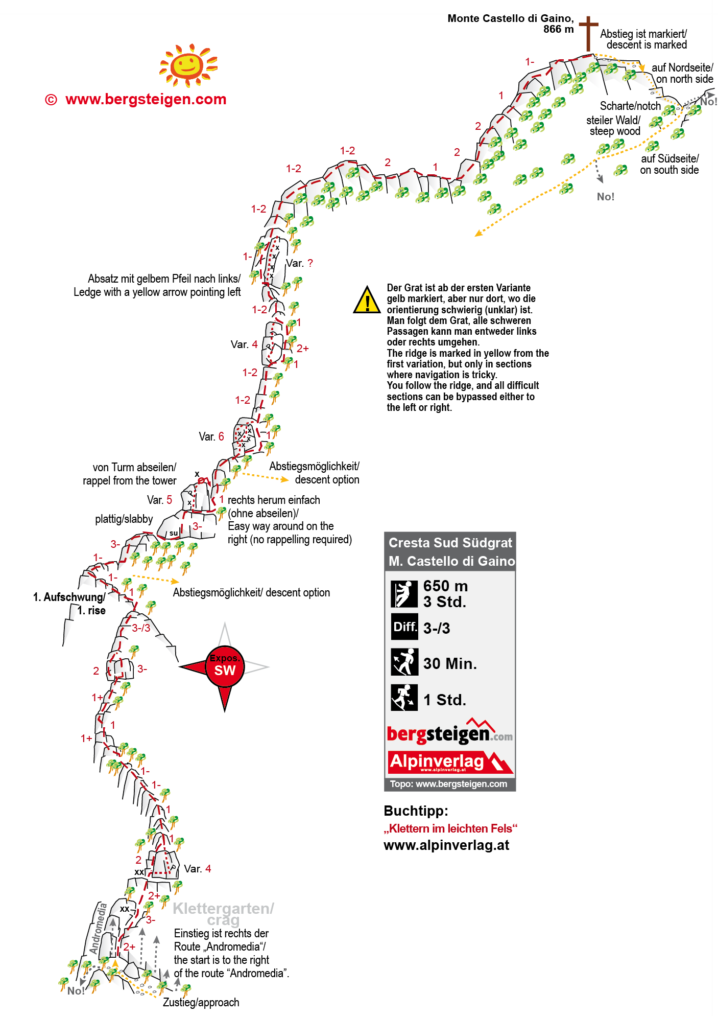 Der Cresta Sud (Südgrat, welche eigentlich ein Südwestgrat ist) auf den Monte Castello di Gaino ist eine perfekte Tour direkt oberhalb des im Süden viel breiteren Gardasees. Der Fels ist von Wasser geformt und hervorragend zu klettern. Wer genug Zeit, Kraft und Mut hat, kann sich an den Varianten der einzelnen Grattürmen versuchen. Es ist aber auch ein Erlebnis auf der leichtesten Route - die den 3ten Grad nie übersteigt - nach oben zu klettern. Am Ende zieht die Tour auf einem schönen, leichten Grat direkt bis zum Gipfelkreuz.