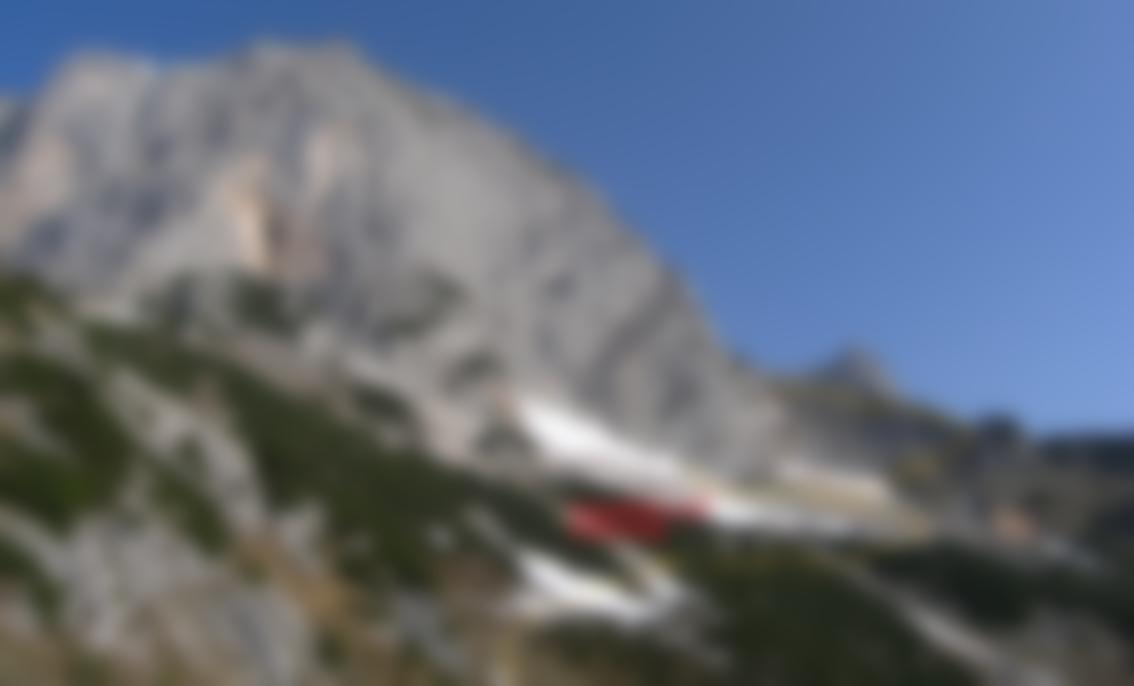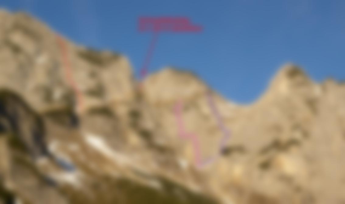 a: Abstieg zum Wanderweg und dort rechts zum Beginn des Grubenpfades, über den Grubenpfad (Band) in ca. 50 Minuten zum Scheibenkaser. Alpine Erfahrung notwendig (I-II)! Man kann auch den Schnellabstieg nehmen (2 x 26 m abseilen), zum Abseiler gelangt man in einer breiten Einsattelung, dort leiten rote Punkte zum ersten Abseiler (Detail siehe Topo, bei Schnee ist der Grubenpfad heikel).