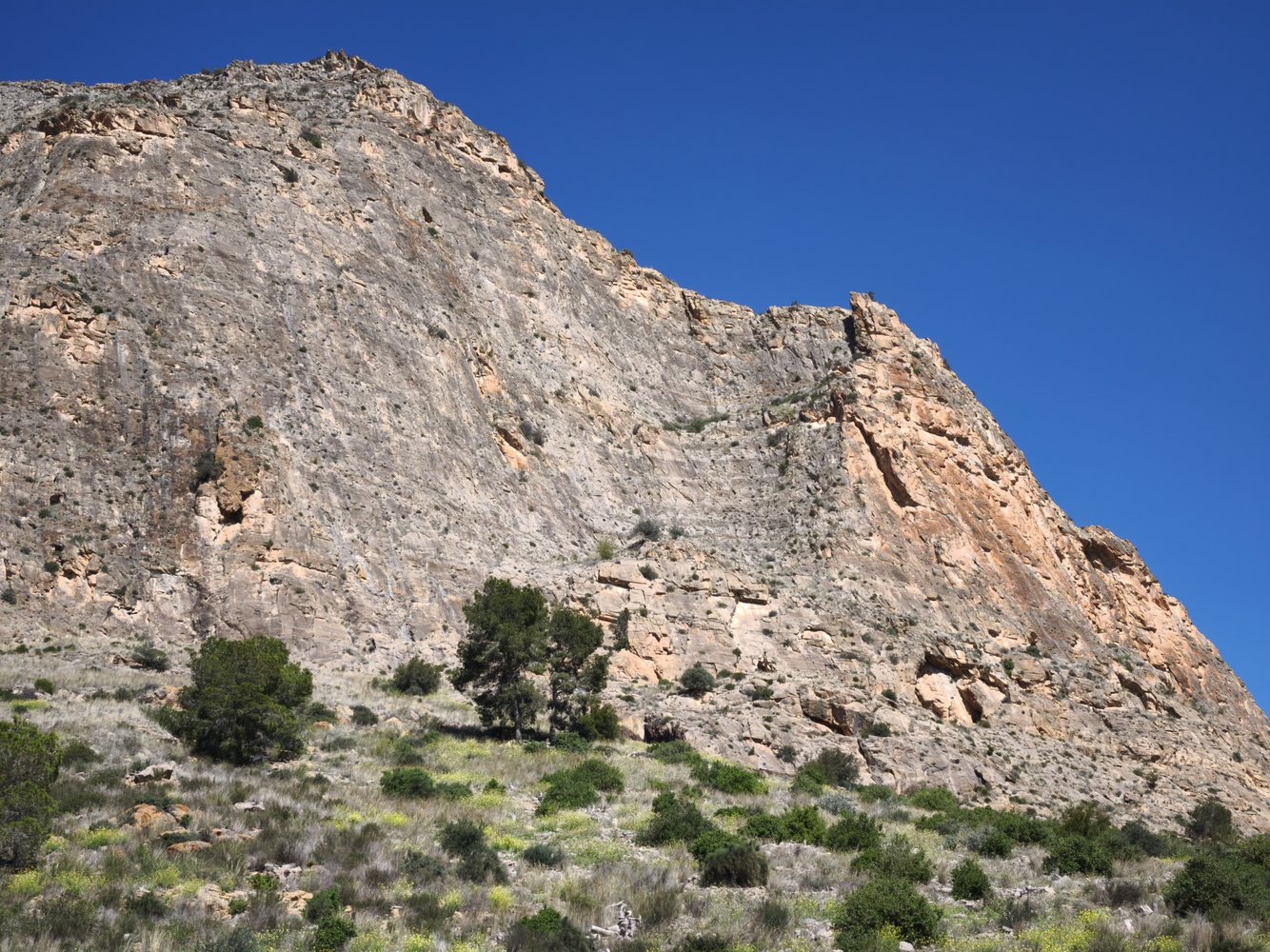 Dieser klassische Mehrseillängen-Kletterweg an der Pared Negra in Orihuela bietet vier Seillängen exzellente Kletterei im kompakten Kalkfels. Der Zugang beginnt direkt am Parkplatz hinter dem Tunnel, von wo aus ein gut sichtbarer Pfad entlang des Bachs zum Wandfuß führt. Der Einstieg ist leicht zu finden, da er sich direkt rechts neben dem markanten vergitterten Förderschacht befindet. Die Route folgt einer logischen Linie entlang eines ausgeprägten Pfeilers bis zum Ausstieg. Der Fels ist durchgehend fest und bietet typische Kalkkletterei mit vielen guten Griffen. Die Absicherung ist modern und zuverlässig, was ein entspanntes Klettern ermöglicht. Achtung, die zweite Seillänge wird gelegentlich mit einer Nachbarroute verwechselt, daher ist es wichtig, dem Verlauf der Haken genau zu folgen. Während des gesamten Aufstiegs genießt man atemberaubende Ausblicke auf die Umgebung und das mediterrane Panorama. Nach dem Durchsteigen aller vier Längen führt ein sicherer Abstieg zurück zum Ausgangspunkt. Dank der Übersichtlichkeit und der hervorragenden Felsqualität zählt „Derecha del Espolón“ zu den beliebtesten Routen in diesem Gebiet.