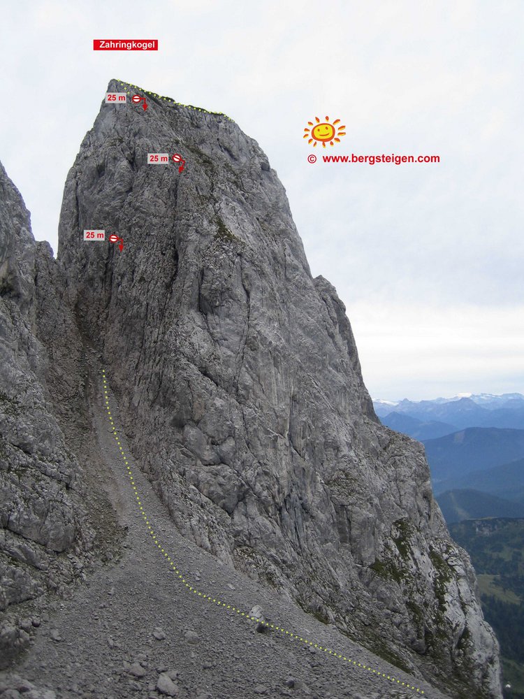 Abseilpiste ( Zahringkogel von Nordwesten), Unterhalb des Gipfel nimmt die sanierte Abseilpiste den kürzesten Weg. Nach dem Gipfel westseitig ca. 10m bis zum Anfang der Abseilpiste absteigen. Danach das 1.x westseitig und danach 2x nordseitig immer in 25m abseilen (bei 50m lässt sich das Seil schwer oder gar nicht abziehen). In die Gamsfeldklamm über eine Schotterriese abwärts und über diese in ca. 30min zurück zum Depot., Foto: Andreas Jentzsch