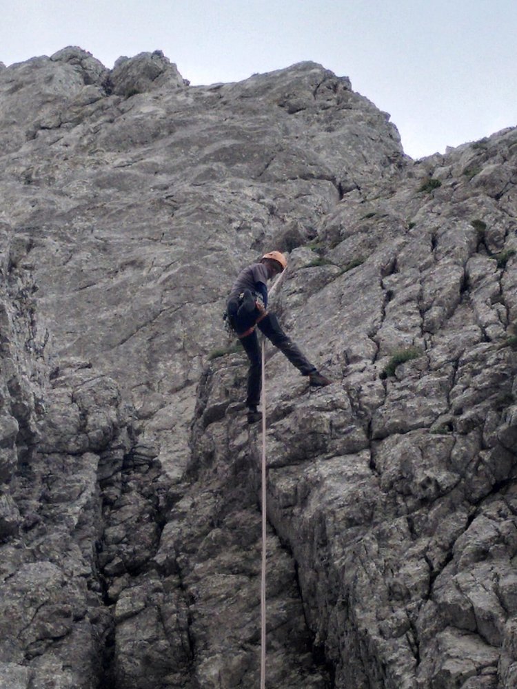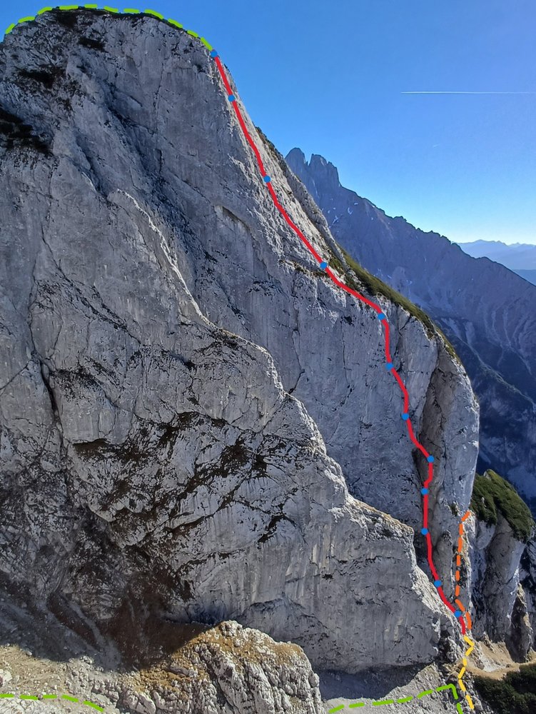 Die anspruchsvollste Seillänge startet bei einem Spalt (schwieriger Aufrichter trotz Henkel / 7- oder A0) und geht nach einem alten NH in eine glatte Platte mit anschließendem kraftigem runden Piaz über (7- oder A0 / 2 BH+2NH+Friend möglich). Nach kurzem Absatz letzte steile Platte (2BH+4NH), welche ebenfalls teils piazend bis zum Stand überwunden wird (6+).