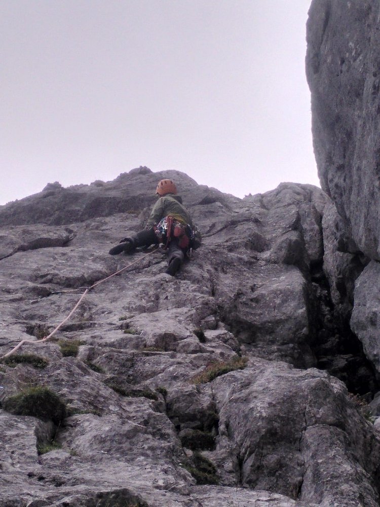 Kurzer, kraftiger, überhängender Piazriss (6-), den man so früh wie möglich nach links verlässt. Danach folgt eine Platte mit Graspolstern (5), Friend möglich. Anschließend im Schuttkessel nach etlichen Metern zum Stand an der rechten Wand.