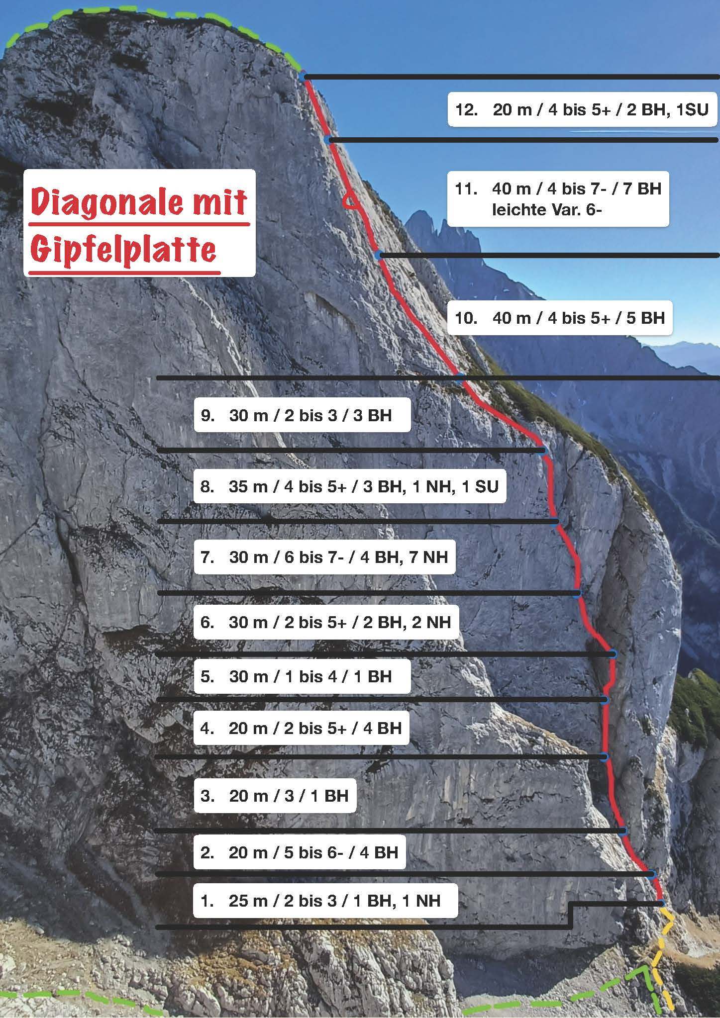 Durch die Sanierung lohnende, abwechslungsreiche, längere alpine Klettertour, mit guter Absicherung in festem Fels. Die Tour beinhaltet Kamine, Verschneidungen, Piazrisse und traumhafte Plattenkletterei ebenso, wie Graspolster und Gehgelände. Die Seillängen 3 bis 5 (Kamin) trocknen nach Regen nur langsam auf, der vorgelagerte Pfeiler lässt keine Sonne zu. Die Seillängen 2, 5, 7 und 8 können zusätzlich mit Friends abgesichert werden. Die Diagonale ist keine reine Plaisirroute, welche trotz guter Beschreibung ein gewisses Gespür für die Routenfindung braucht.