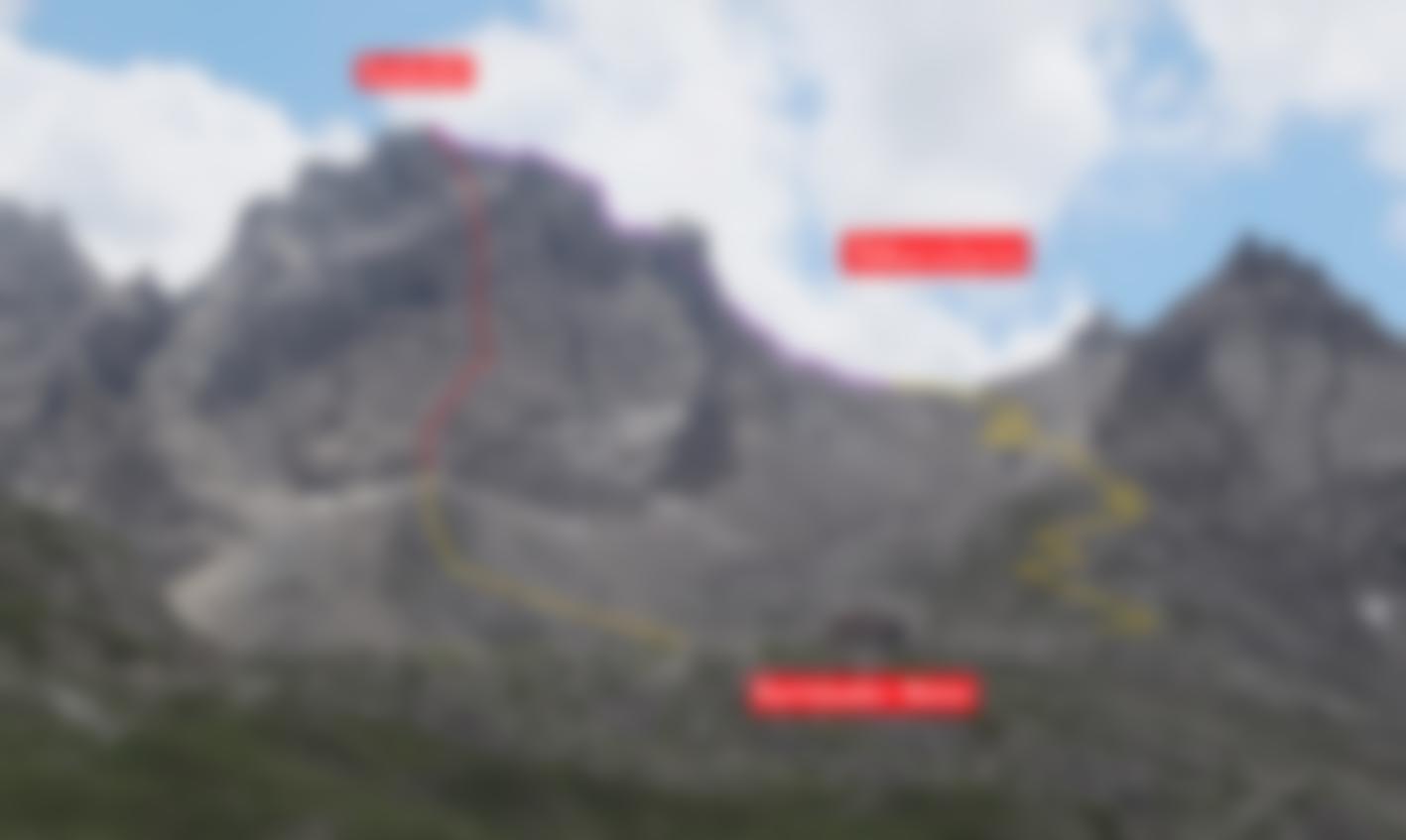 Von der Dolomiten Hütte hinauf zur Karlsbader Hütte. Von der Karlsbader Hütte zum See und über den kleinen Betonwall auf die Westseite des Sees. Gleich nach dem Betonwall zieht ein Pfad hinauf auf den Kamm mit Gras und Blöcken. Auf diesem Kamm nach links auf die Nordwand zu. Man sieht eine gelbe Punktmarkierung, der man entlang des Kammes und oben im Schutt bis zum Einstieg bei einem gelben Kreis folgt.