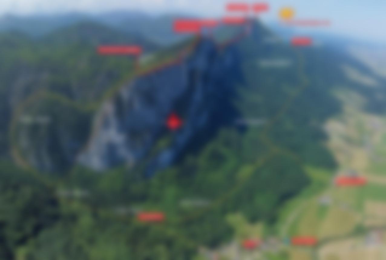 Siehe Topo. Vom Drachenwand-Ostgipfel (1060 m) am Grat entlang, über die schmale Steinbrücke des Drachenwandloches (1-, Sicherungsmöglichkeit an Bohrhaken) und bald hinunter in eine tiefe Scharte, wo man den markierten Weg 12 A noch einmal berührt. Dort entweder direkt eine Felsstufe hinauf klettern (1) oder rechts (oft feucht) in einer erdigen Rinne mit Fixseil auf den Grat. Man folgt den Pfadspuren und erreicht den Basejump Point (Gedenktafel) und später den Drachenwand-Hauptgipfel (1176 m). Links vom Grat weiter hinunter (Pfadspuren), man kommt zum zweiten Drachenloch. Danach weiter und in steilem Gras zum Drachenwand-Westgipfel (1138 m) aufsteigen. Vom Gipfel links vom Grat abwärts zu einem unscheinbaren Türmchen, dort steil, grasig abklettern (1). Man folgt den Pfadspuren, man kommt zu einer weiteren Abkletterstelle (2 Stufen, 1). Ab dort folgt längeres, nicht immer ganz klares Gegehlände, man folgt in der Regel den Pfadspuren (tlw. wenige, schwache rote Punkte) bis man vor dem steilen Aufschwung an der Schatzwand steht. In den Felsen in schöner Kletterei (1) aufwärts, dann auf dem Wiesengrat zum Gipfel der Schatzwand (1264 m) mit schönem Holzmarterl. Vom Gipfel der Schatzwand weiter auf dem kurz etwas ausgesetzten Grat (1), dann wieder im Buschwald den Pfadspuren bis zu den Felsen des Schobers folgen. Die erste Stufe kann man links (südseitig) umgehen, dann auf dem Grat bis zu den steilen Felsen unterhalb des Schober-Gipfels. Ein Gendarm (kleiner Turm) wird ausgesetzt überklettert oder südlich umklettert (2). An der Wand danach steckt ein Bohrhaken, dort gerade, steil aber griffig hinauf und am Ende gestuft zum Gipfel des Schober (1328 m). Dort entweder direkt hinunter zur Ruine Wartenfels und weiter zum Parkplatz bzw. kann man noch links zum nahen Frauenkopf (1303 m) und von diesem auf dem Weg Nr. 10 zum Parkplatz unterhalb der Ruine abstiegen.