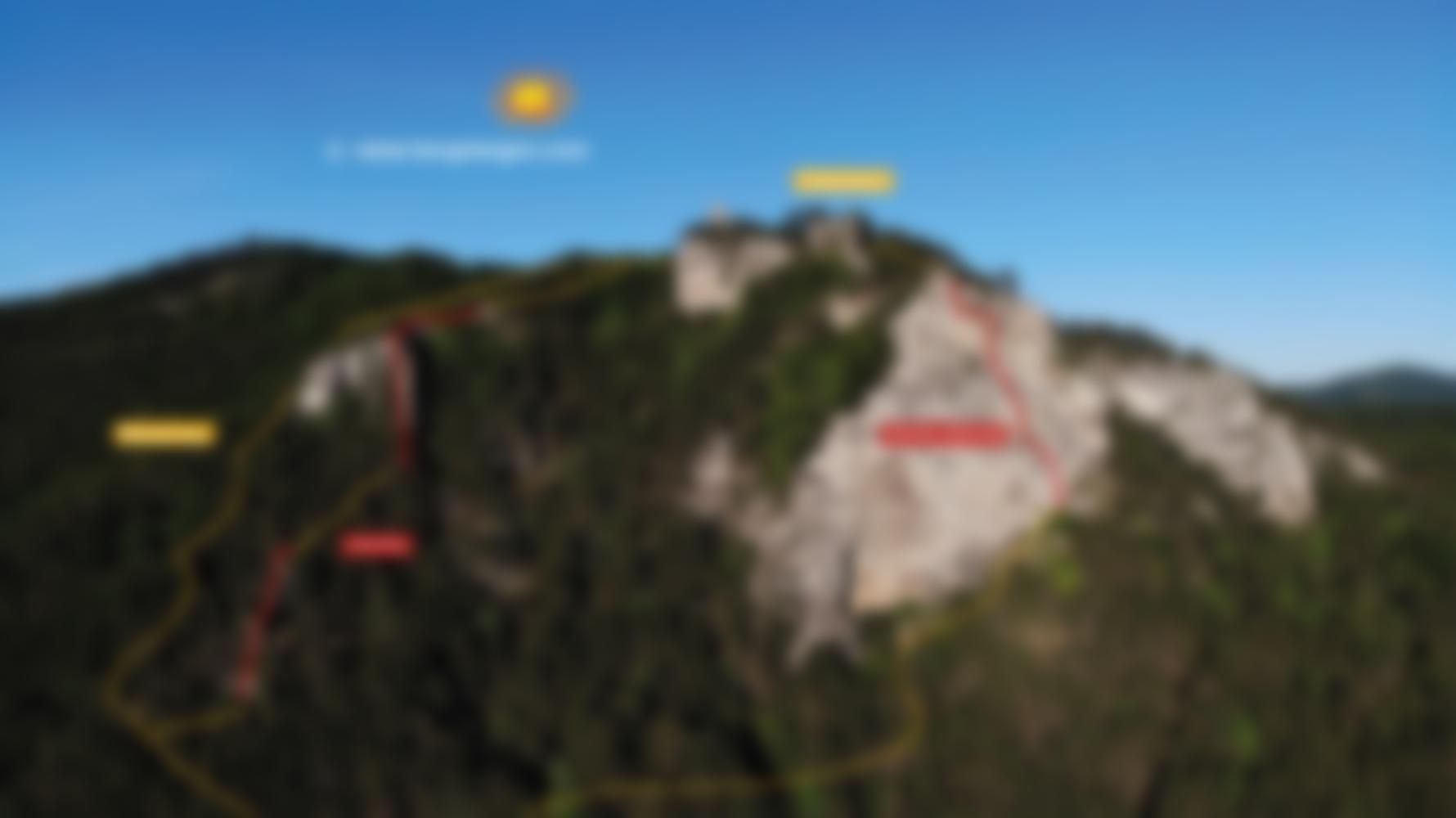 Am Fuß des Turmes rechts aufwärts, um die Kante und hinauf auf den ersten Turm (2). Am Grat entlang auf den zweiten Turm (2) und rechtshaltend hinunter in eine Scharte im Wald (2). Hier berührt man den Wanderweg. Rechts um den nächsten Felsaufbau herum gehen (links sieht man die Durchgangshöhle) und zur Wand mit dem Gratfenster. Steil hinauf zum Fenster (2 oder 3-), rechtshaltend auf den Grat (2) und oben luftig nach links (2-). Am Grat weiter, die Türmchen überschreiten (dritter Turm, Zackengrat) und plattig hinunter (1+) in eine Scharte. Steil und etwas brüchig auf den vierten Turm (2) und kurz bergab (1-). Von hier kann man wieder nach links zum Wanderweg gelangen. Am Rücken im Wald auf Steigspuren weiter, zuletzt unter einer neckischen Felsschuppe zur Ruine am höchsten Punkt.
