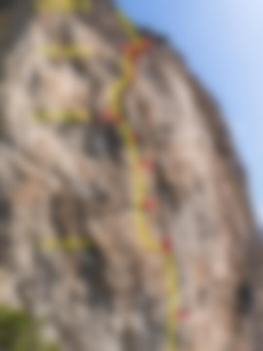 Die Absicherung ist überwiegend mobil möglich, fünf Zwischenhaken und fünf Standhaken wurden gesetzt und belassen. Besonders die letzten 20 Meter sind aufgrund brüchigen Gesteines mit Vorsicht zu genießen und schwieriger zu sichern. Die letzten beiden Seillängen können problemlos zusammen geklettert werden.