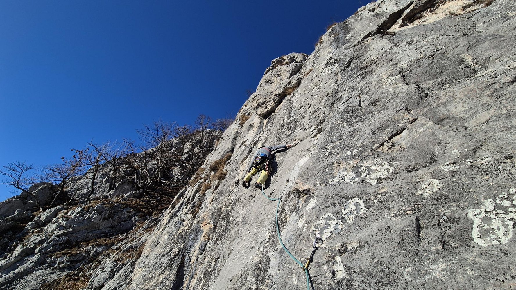 1SL: Den SU folgend und in einer Linksschleife (hier etwas brüchig und Runout) zu einer kleinen Pfeilerkante, links der Kante empor und unschwierig zum Stand. 30m 5+