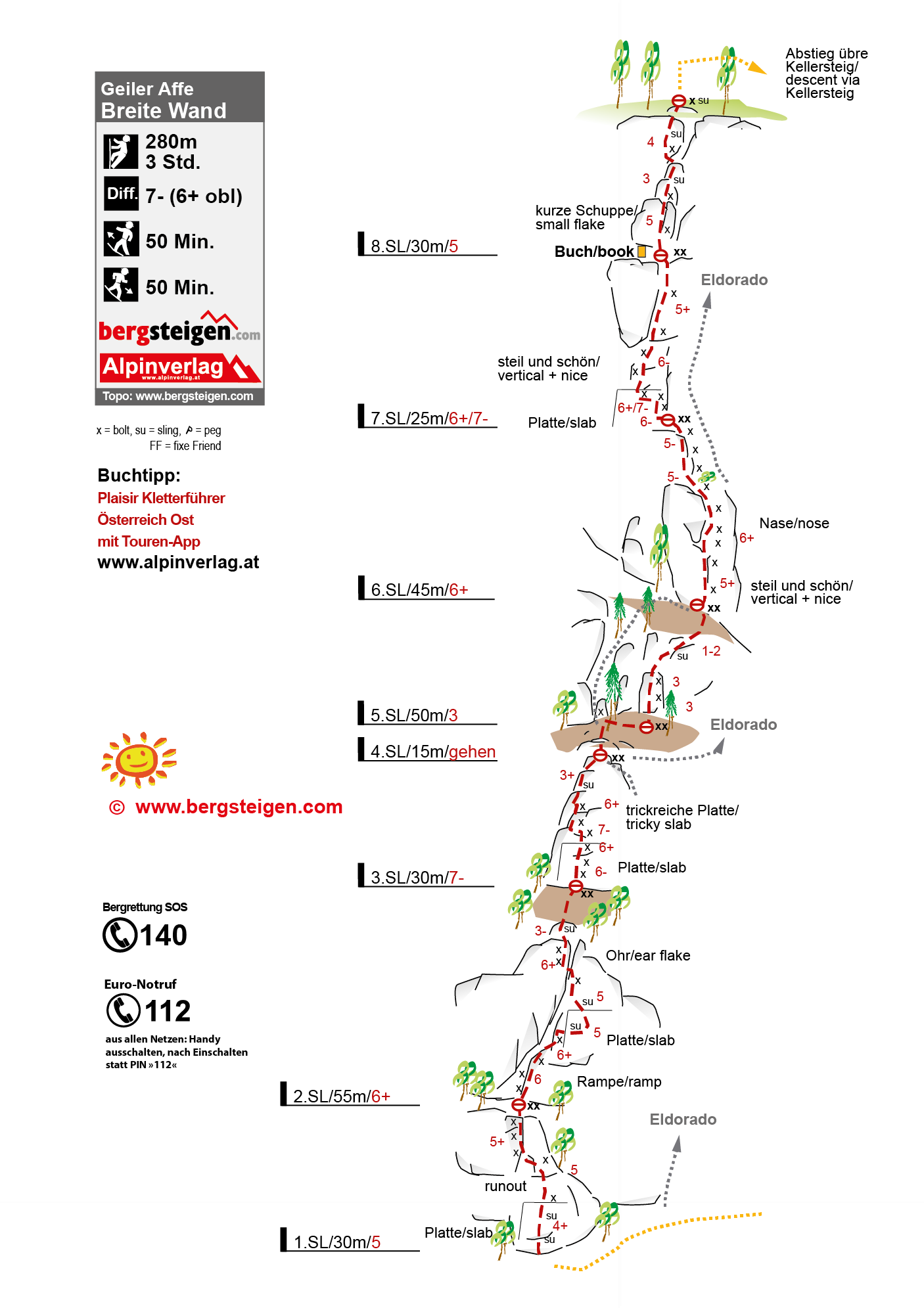 3SL: An toll strukturierter Wand in einer Linksschleife immer griffloser zur kleinen Kante. Schlüsselstelle. Weiter nach rechts zu schmalen Band hier nochmal interessant nach links und weiter bis gemeinsamen Stand von Eldorado. 30m 7-