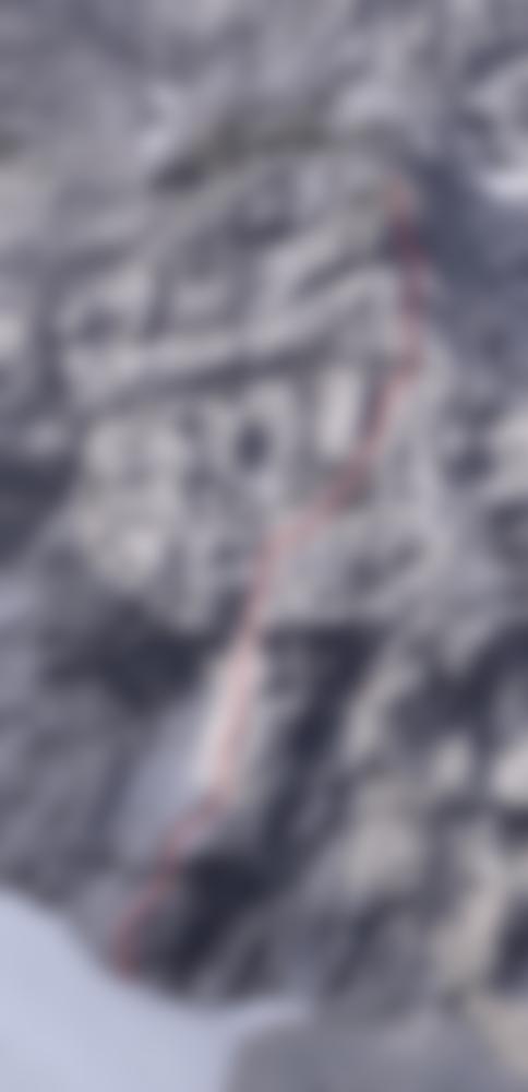 Logische Linie vom großen Altschneefeld bis zu Grasfleck mit zwei kleinen Bäumen, die im unteren Bereich teils schöne Wandstellen und Wasserrillen nutzt. Herrlicher, bombenfester Fels in der unteren Hälfte, ab der Schlüsselstelle ist etwas mehr Vorsicht geboten, da die Felsqualität nachlässt.