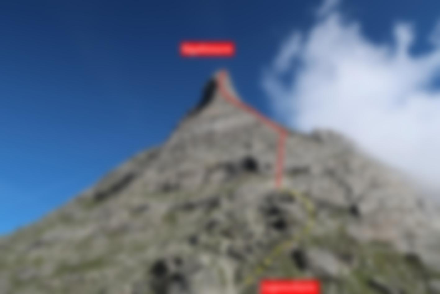 Vom Ende der Kletterei in eine Scharte abseilen (20 m). Von dort entlang des Grates (oder tlw. leichter westlich davon) zum Hauptgipfel (2-3 UIAA). Dort auf dem steilen aber markierten Normalweg hinunter zur Greizer Hütte und von dieser zurück ins Tal.