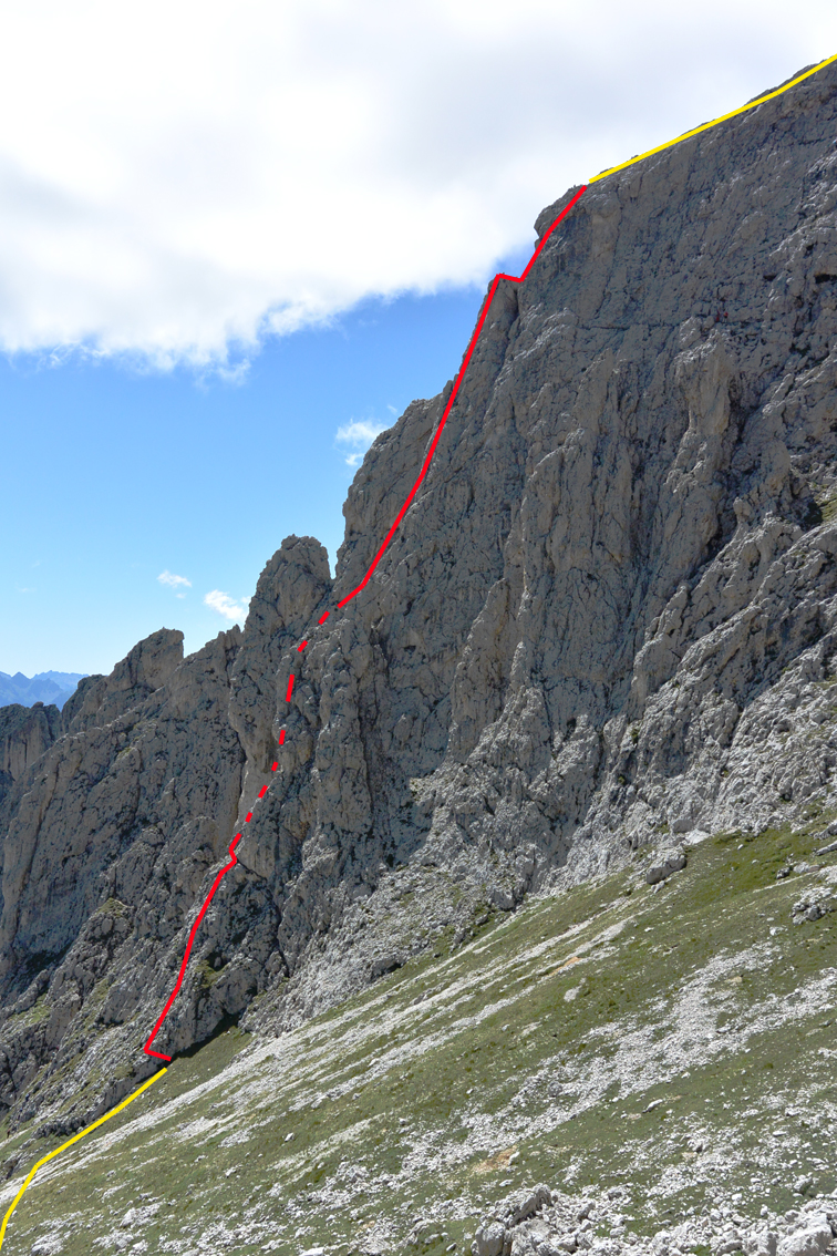 Ein oft begangener Dolomitenklassiker, der schöne, steile und griffige Genusskletterei bietet. Der Anstieg ist sehr beliebt und wird auch gerne von Bergführern mit Gästen gemacht. Man kann auf div. Varianten hinauf auf die Teufelswandklettern - schönes alpines Klettererlebnis direkt neben der Rotwand.