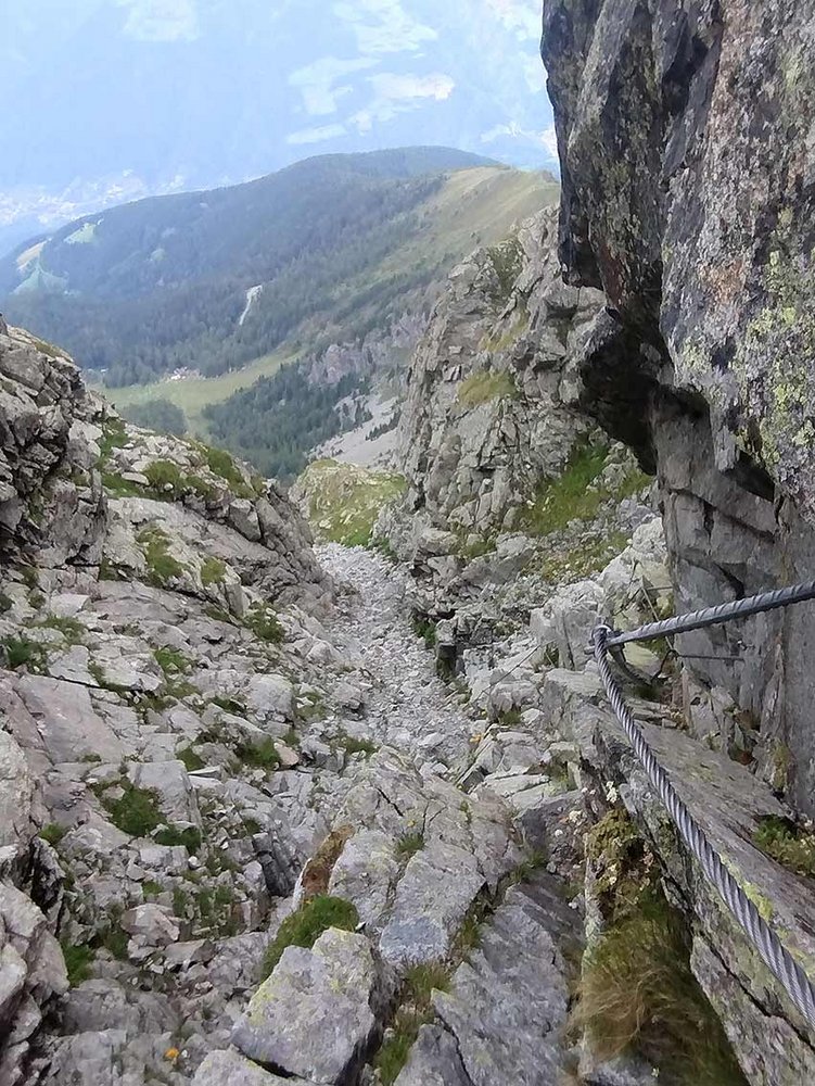 Die steilen Felspassagen sind mit einem Klettersteigseil (Stahlseil) gesichert, die leichten Passagen muss man frei klettern.