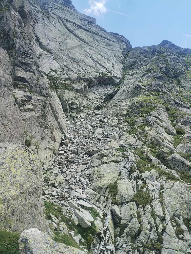 Von der Scharte über Blöcke die Rampe hinauf, dann rechts auf Platten (Stellen bis 2-, das sind die schwersten Kletterpassagen der Tour) hinauf zum Stahlseil an der Kante. Ein kurzes Klettersteigstück (A/B) und kurze Kletterpassagen 1 führen zu grasigem Gelände. Links über eine Stufe (1-) zur nächsten Klettersteigpassage (A), danach gestuft im steilen, felsdurchsetzen Gras (1-) höher. Auf einem breiten Rücke im Blockgelände aufwärts (1-) bis zu einer Stufe (1, oben steckt ein Haken). Danach quert man zu einer Kante mit rotem Pfeil (Bohrhaken). Dort dann auf Platten (1-) nach links queren, bis man in die sog. Luther-Rinne kommt. In der breiten Schuttrinne aufwärts, über eine kurze Felsstufe (1-) zu den Klettersteig-Sicherungen am linken Rinnenrand. Entlang des steilen Stahlseils (bis C) höher, dann nach links auf einem Band (A) aus der Rinne queren. Auf Pfadspuren hinauf bis man vor einer kleinen Scharte nach links über eine Stufe (1-) zum letzten Klettersteigabschnitt gelangt (Kette, B). Am Ende der Kette kurz auf dem Band nach links, dann gestuft (1-) gerade hinauf bis zum Gipfelkreuz.