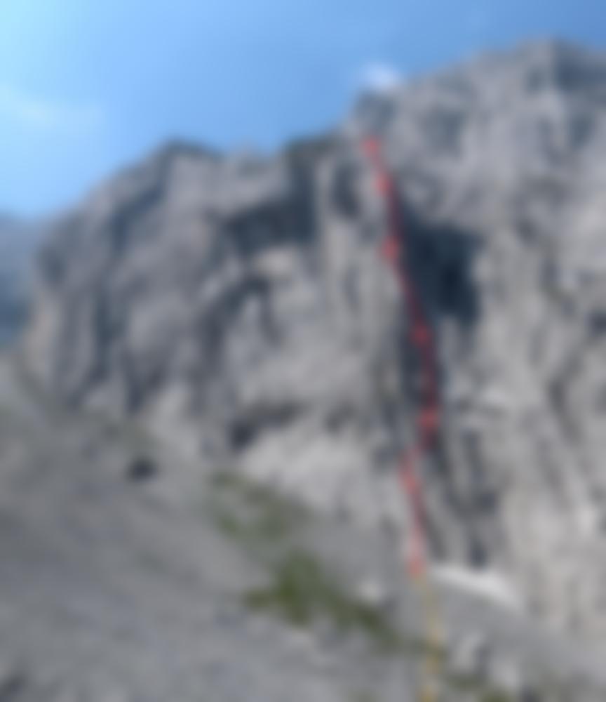 Schöne alpine Kletterei entlang einer klassischen Linie an Rissen und Rampen, im oberen Teil herrlich luftig! Herzstück bildet eine riesige, von Rissen durchzogene Platte, die einen alpinen Vorsteiger erfordert. Die Linie ist bereist von der Griesner Alm sehr gut zu sehen.