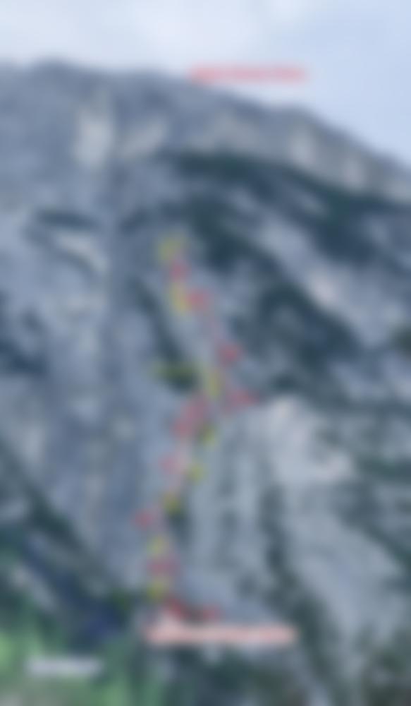 Abseilen über die Route (siehe Wandbild mit eingezeichneten Abseilstellen) – Nach dem 2. Abseiler kurz 10 Meter unschwer zum nächsten Abseilstand abklettern. Beim letzten Abseiler Prusikknoten und Einhängen einiger Exen empfohlen.