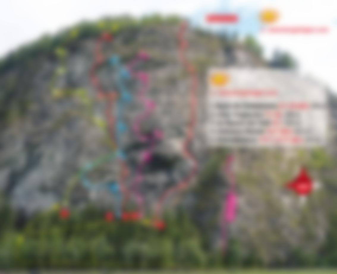 Am Ende der Route abseilen (siehe Topo, 50 m Doppelseil nötig!). Alternativ kann man im Wald aufwärtsgehen, man kommt dann rechts zum Klettersteigabstieg.