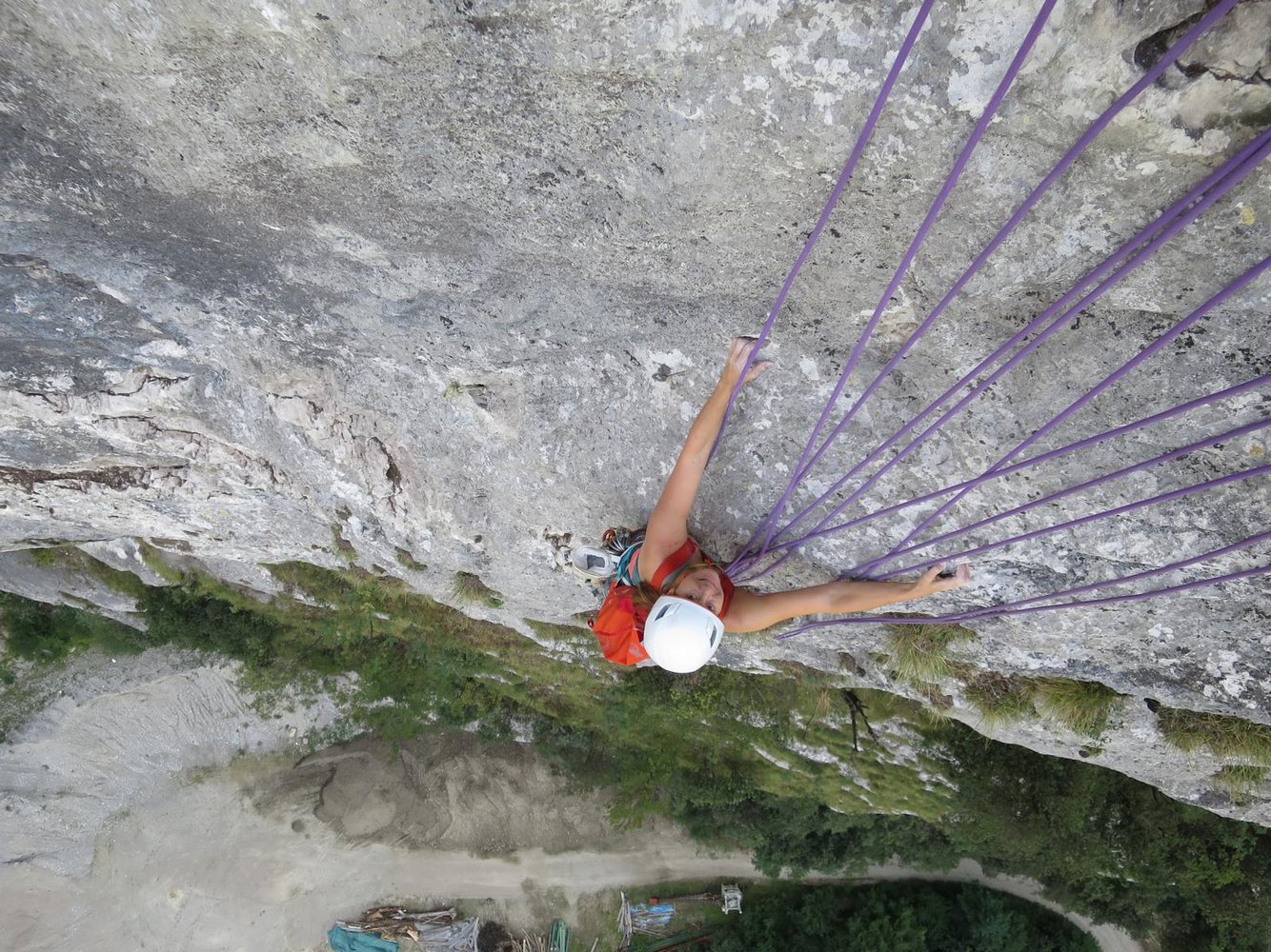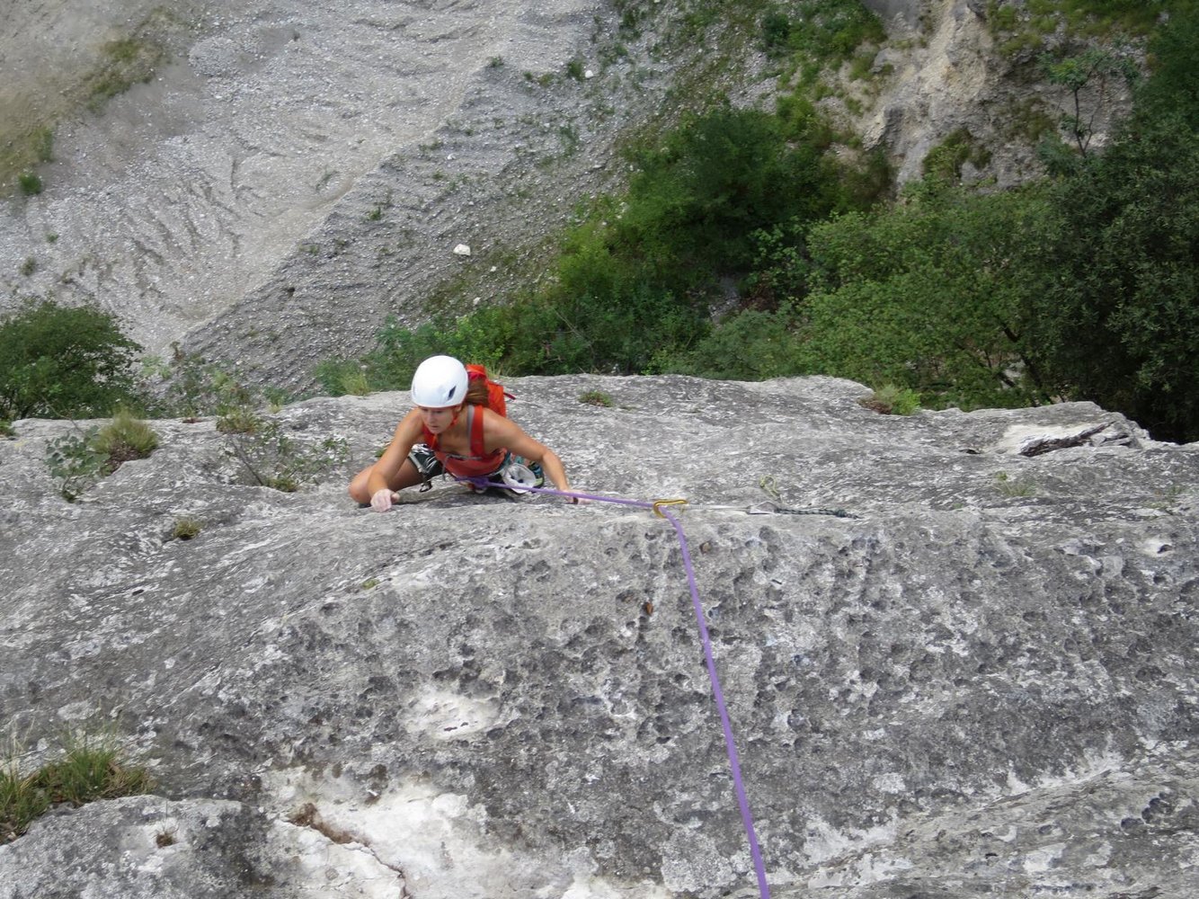 Die Tour ist gut, mit wenigen Bolts, vielen Sanduhren und einigen Normalhaken gesichert. Die zwei Runouts kann man mit Cams Gr. 1-2 oder Rocks gut entschärfen.