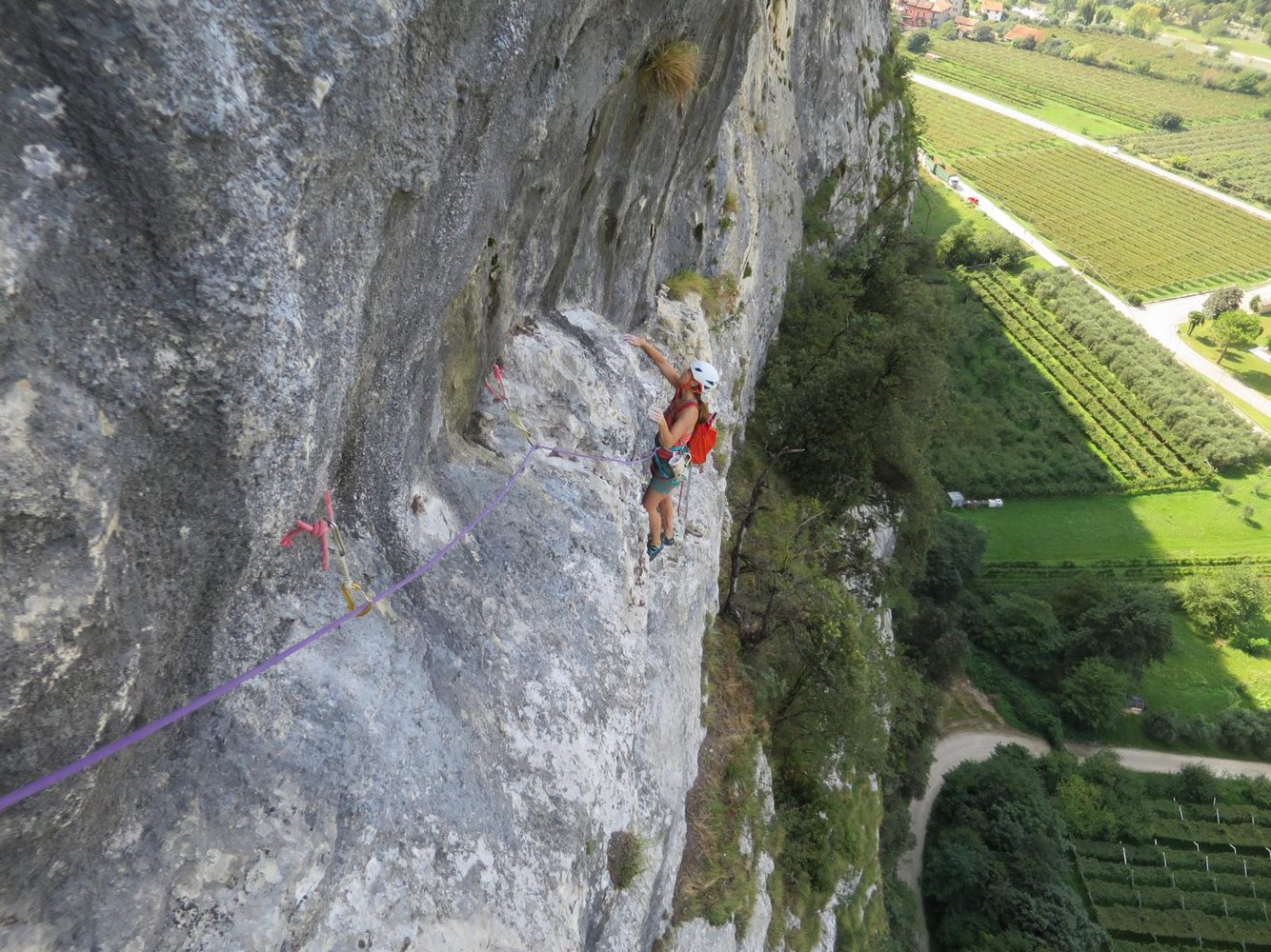 Vom Ausstieg nach links (in Richtung Norden) und auf einem Pfad der Felskante entlang. Dann rechts entlang von Steinmännchen auf dem Pfad bis zum Wanderweg. Auf dem Wanderweg dann nach San Martino/Arco absteigen.