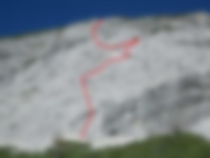 Über die Route abseilen - vom Stand der 6. SL führt eine Abseilpiste die riesige schräge Rampe außerhalb der Route zu den Einstiegsschrofen. Die Rampe kann auch abgeklettert werden. (Steinschlag möglich)