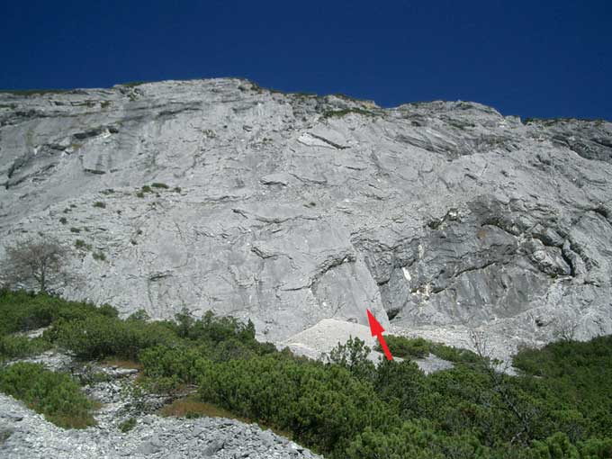 Vom hinteren Parkplatz in Scharnitz mit dem Rad das Hinterautal etwa 12 km bis kurz vor die Isar – Ursprünge. Auf der linken Seite befindet sich unterhalb des Tratenköpfl die große Plattenflucht. Die Schuttrampe etwa ¼ h zum Einstieg hinauf und oberhalb der Latschen rechts 200 m am Fels entlang zum Einstieg. Noch weiter rechts befindet sich der riesige Felsausbruch, der vom Weg gut zu erkennen ist.