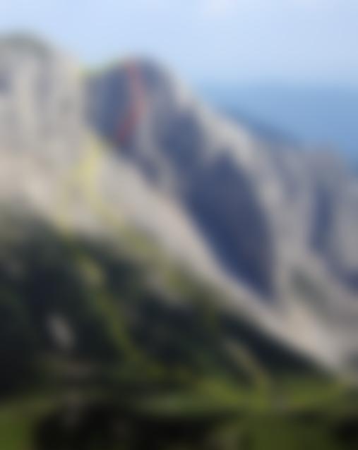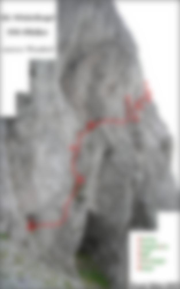 Der Einstieg befindet sich li. oberhalb einer riesigen höhlenartigen Nische bei einer kleinen Nische mit roter Erde – Bühlerhaken. Die Tour beginnt mit einer ausgesetzten Querung nach re. an gut griffiger Wand (der 1. H. ist etwas versteckt) und führt über einen Riss zu schmalem Band (35 m, 5 bis 6-). Nun steil li. hinauf zu der Rissverschneidung. Durch diese, an dessen Ende befindet sich die Schlüsselstelle, und dann re. über plattigen Fels zu Stand (30 m, 5- a0 oder 6 wenn frei). Jetzt waagerecht nach re. um eine Kante, ein wenig runter und wieder rauf zu einem großen Köpfl. Dahinter hinab zu Stand (30 m, 5- / 3, Seilreibung!). Vom Stand den weißen Riss empor und an einer Schuppe li. ansteigend, später eine Rampe nutzend zu luftigen Stand an der Pfeilerkante (25 m, 5- / 3). Von hier 3 SL re. der Pfeilerkante empor auf gr. Absatz (105 m, 3 bis 4+). ACHTUNG: Das kleine Band nach re. nicht verpassen – li. vielleicht in Summe weniger schwierig, jedoch keine Haken und kaum gute Risse zum Legen von Klemmkeilen. Es empfiehlt sich den von Türmchen und Absetzen gegliederten letzten Abschnitt in 2 SL zu bewältigen. Im Zweifelsfall eher re. haltend zur Gipfelwiese ansteigen.