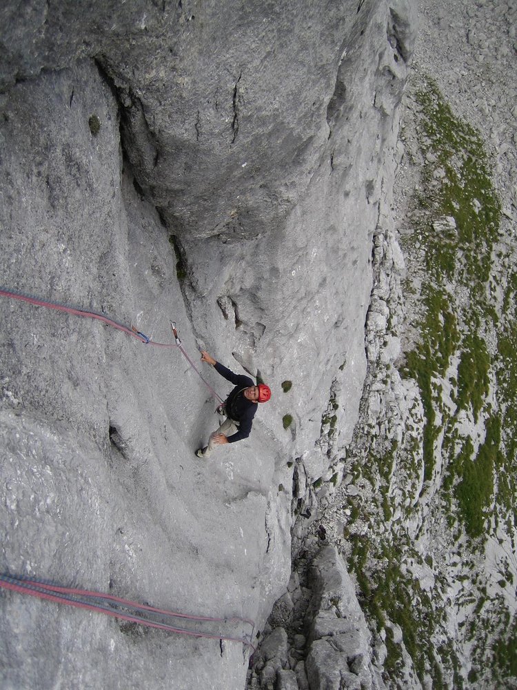 Großartige Tour durch kompakten Plattenfels, mit kniffligen Einzelstellen. Die letzte Seillänge ist leicht und unlohnend, man seilt daher am besten davor 2 x ab (siehe Topo).