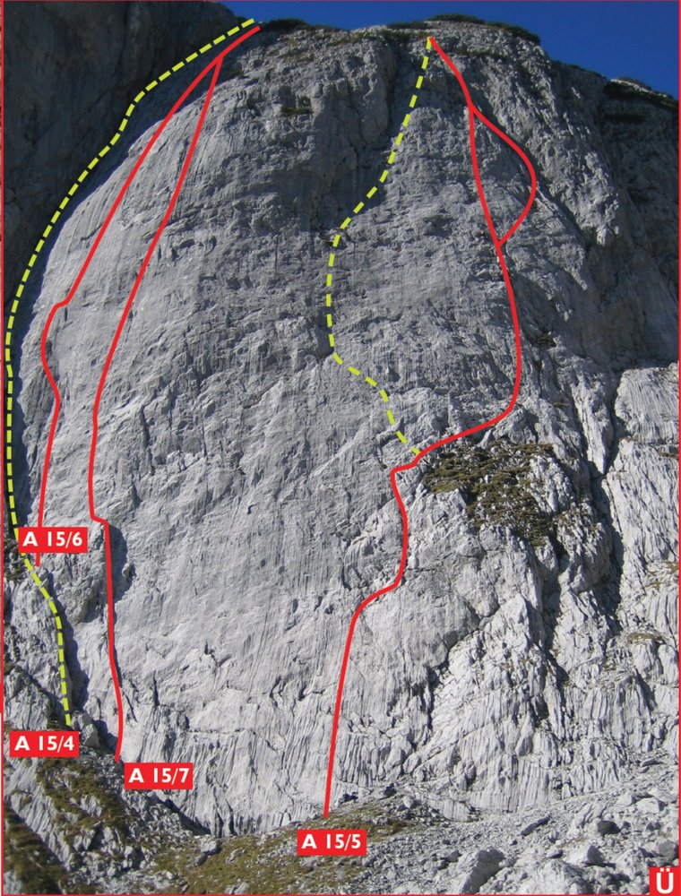 Wie Nördliche Südostwand, oder besser vor der letzten Seillänge 2 x über die Tour „Hart aber Herzlich“ abseilen (siehe Topo).