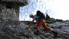 Nach dieser ersten schönen Kletterei kurz nach rechts ansteigen und dem Grat weiter folgen, bis man nach links abgedrängt wird, und zum nächsten Aufschwung gelangt. Hier nach links in eine Nische um eine Platte mit Querriss zu überklettern. Schließlich über einen grasdurchsetzten Fels am Grat entlang und dann nach links zum Gipfel mit Gipfelbuch!